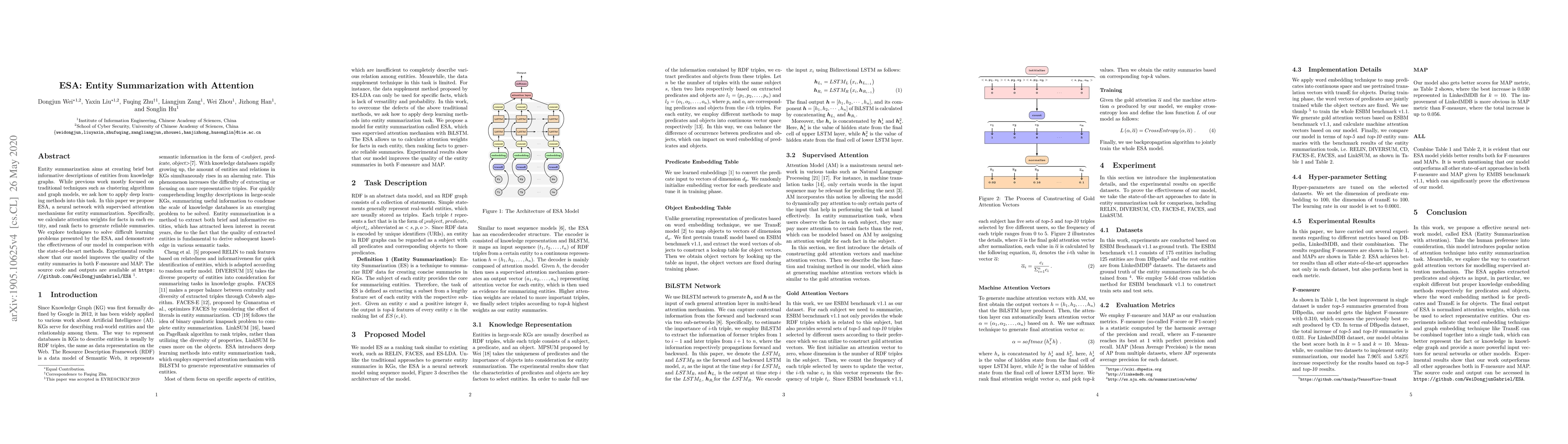 Title: ESA: Entity Summarization with Attention Summary: This paper proposes ESA, a neural network with supervised attention mechanisms for generating concise entity summaries from knowledge graphs, outperforming traditional methods and achieving better results in F-measure and MAP.