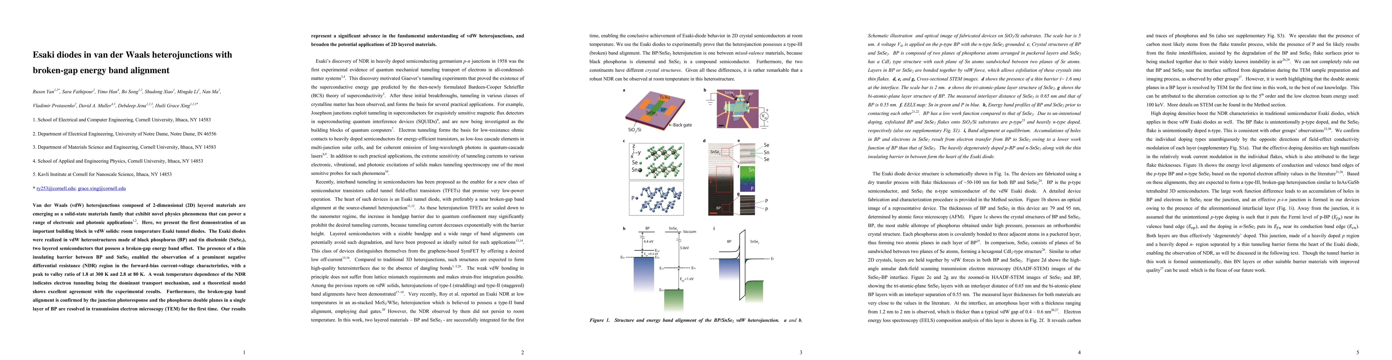 This paper presents the first room temperature Esaki tunnel diodes in van der Waals heterojunctions made of black phosphorus and tin diselenide, demonstrating a prominent negative differential resistance with a peak to valley ratio of 1.8 at 300 K. The study highlights the broken-gap band alignment and confirms it via junction photoresponse and TEM imaging.