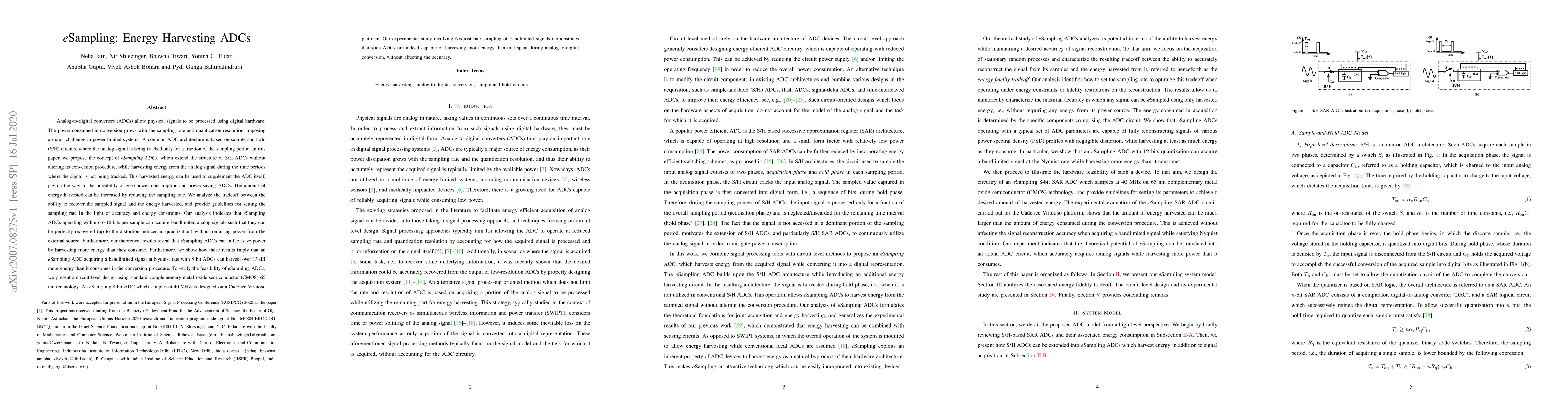 Analog-to-digital converters (ADCs) allow physical signals to be processed using digital hardware. The power consumed in conversion grows with the sampling rate and quantization resolution, imposing a major challenge in power-limited systems. A common ADC architecture is based on sample-and-hold (S/H) circuits, where the analog signal is being tracked only for a fraction of the sampling period. In this paper, we propose the concept of eSampling ADCs, which harvest energy from the analog signal during the time periods where the signal is not being tracked. This harvested energy can be used to supplement the ADC itself, paving the way to the possibility of zero-power consumption and power-saving ADCs. We analyze the tradeoff between the ability to recover the sampled signal and the energy harvested, and provide guidelines for setting the sampling rate in the light of accuracy and energy constraints. Our analysis indicates that eSampling ADCs operating with up to 12 bits per sample can acquire bandlimited analog signals such that they can be perfectly recovered without requiring power from the external source. Furthermore, our theoretical results reveal that eSampling ADCs can in fact save power by harvesting more energy than they consume. To verify the feasibility of eSampling ADCs, we present a circuit-level design using standard complementary metal oxide semiconductor (CMOS) 65 nm technology. An eSampling 8-bit ADC which samples at 40 MHZ is designed on a Cadence Virtuoso platform. Our experimental study involving Nyquist rate sampling of bandlimited signals demonstrates that such ADCs are indeed capable of harvesting more energy than that spent during analog-to-digital conversion, without affecting the accuracy.