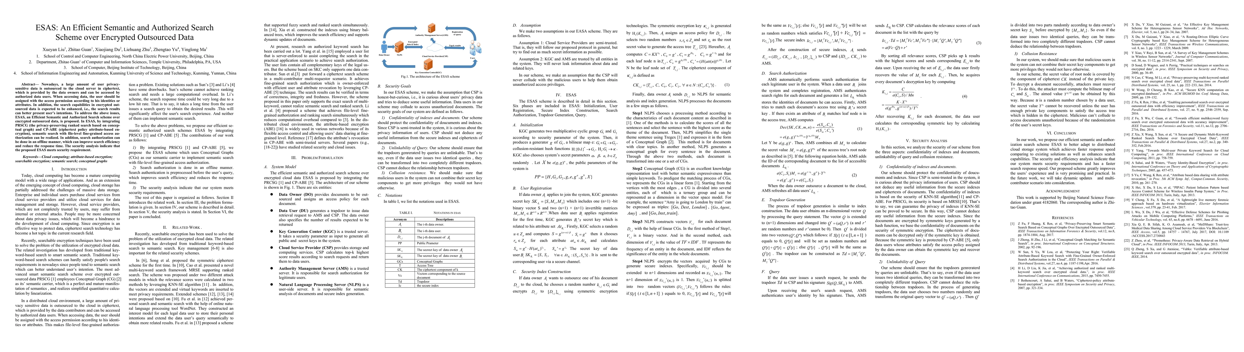 ESAS proposes an efficient scheme for semantic and authorized search over encrypted outsourced data, integrating PRSCG and CP-ABE to enable fine-grained access control and offline search authorization, enhancing search efficiency and security. The scheme ensures data privacy and meets security requirements.