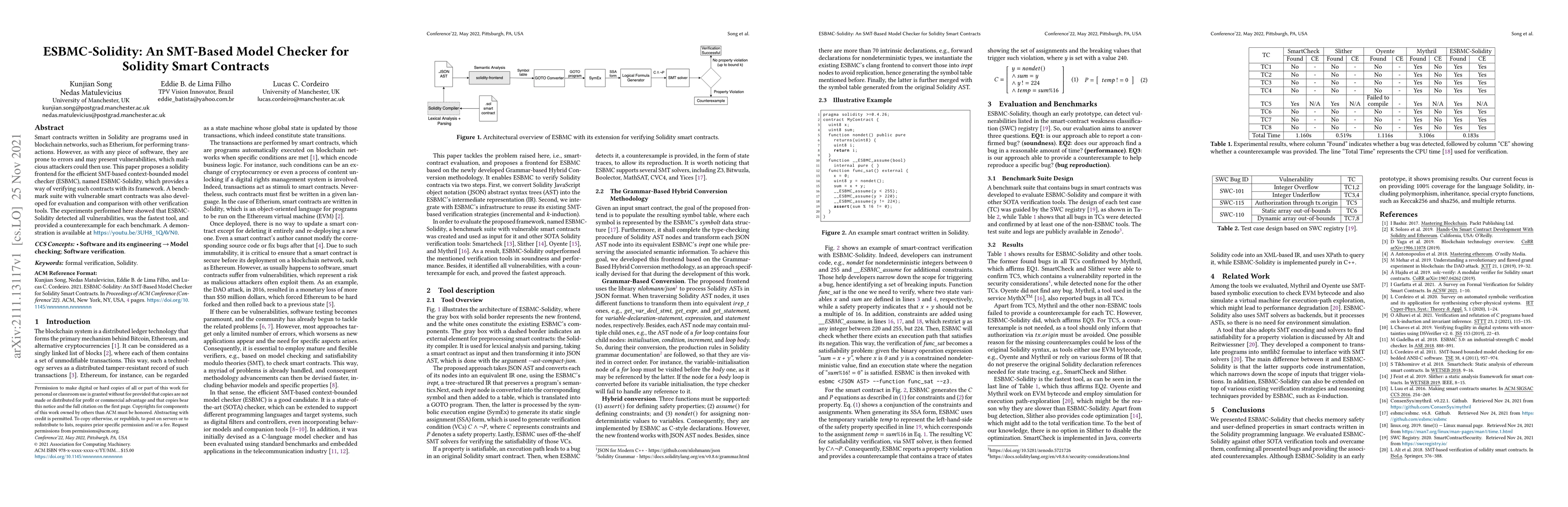 ESBMC-Solidity is an SMT-based model checker for verifying Solidity smart contracts, successfully detecting all vulnerabilities in benchmark tests and proving to be the fastest verification tool available. The tool also provides detailed counterexamples for each detected issue.