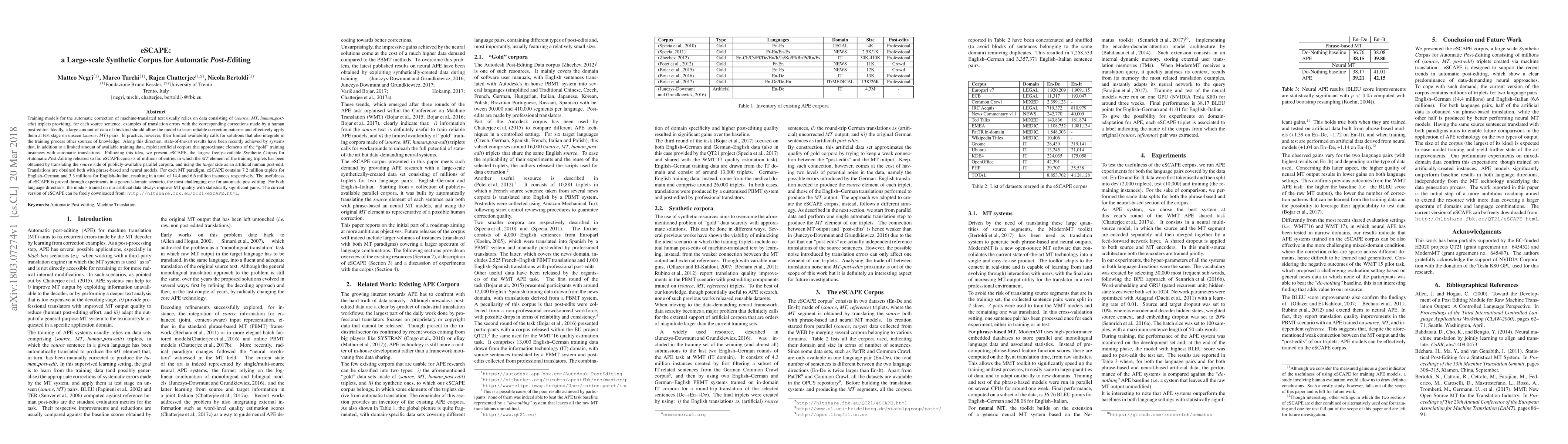 eSCAPE is a large synthetic corpus for training automatic post-editing models, containing millions of triplets generated by translating publicly-available parallel corpora and using the target side as an artificial post-edit. Models trained on this data show statistically significant improvements in machine translation quality.