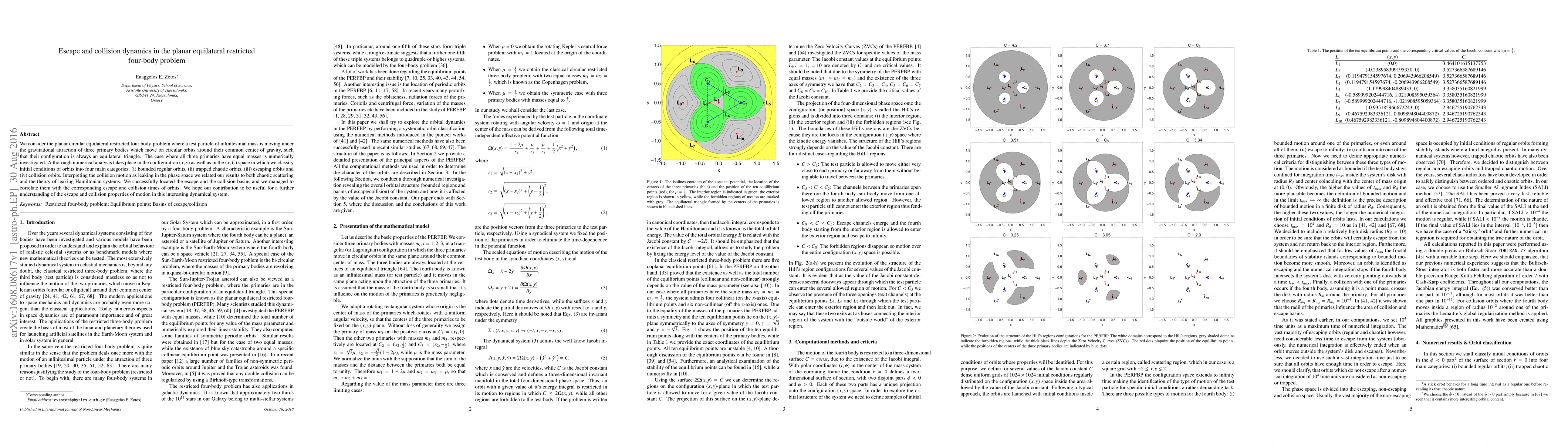 This paper investigates the planar circular equilateral restricted four-body problem, focusing on the dynamics of a test particle under the gravitational influence of three equal-mass primary bodies. It classifies initial conditions into four categories: bounded regular, chaotic, escaping, and collision orbits, and correlates these with escape and collision basins and times.