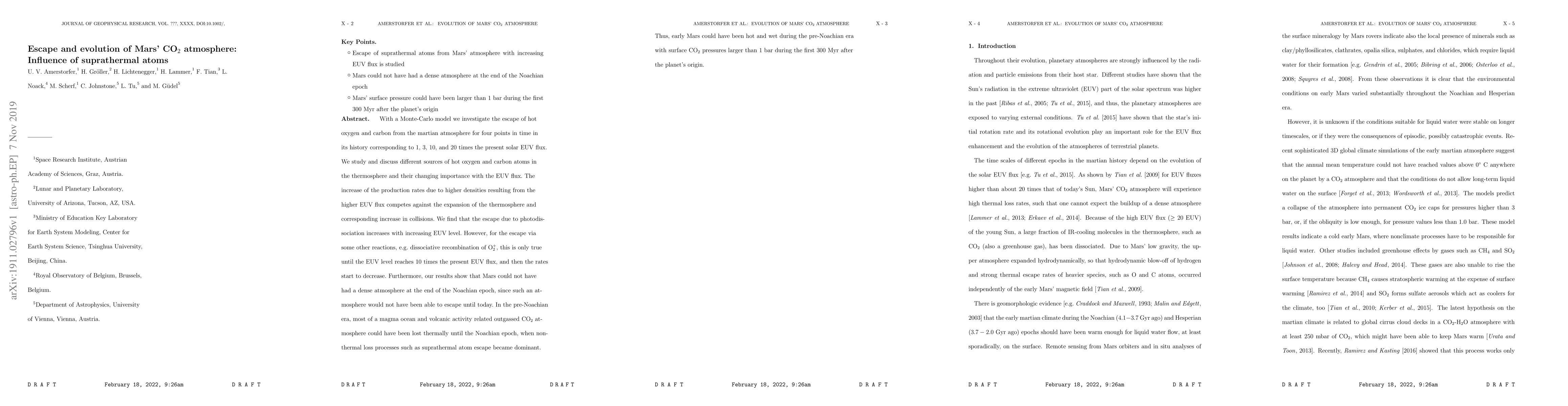 With a Monte-Carlo model we investigate the escape of hot oxygen and carbon from the martian atmosphere for four points in time in its history corresponding to 1, 3, 10, and 20 times the present solar EUV flux. We study and discuss different sources of hot oxygen and carbon atoms in the thermosphere and their changing importance with the EUV flux. The increase of the production rates due to higher densities resulting from the higher EUV flux competes against the expansion of the thermosphere and corresponding increase in collisions. We find that the escape due to photodissociation increases with increasing EUV level. However, for the escape via some other reactions, e.g.~dissociative recombination of O$_2^+$, this is only true until the EUV level reaches 10 times the present EUV flux, and then the rates start to decrease. Furthermore, our results show that Mars could not have had a dense atmosphere at the end of the Noachian epoch, since such an atmosphere would not have been able to escape until today. In the pre-Noachian era, most of a magma ocean and volcanic activity related outgassed CO$_2$ atmosphere could have been lost thermally until the Noachian epoch, when non-thermal loss processes such as suprathermal atom escape became dominant. Thus, early Mars could have been hot and wet during the pre-Noachian era with surface CO$_2$ pressures larger than 1 bar during the first 300 Myr after the planet's origin.