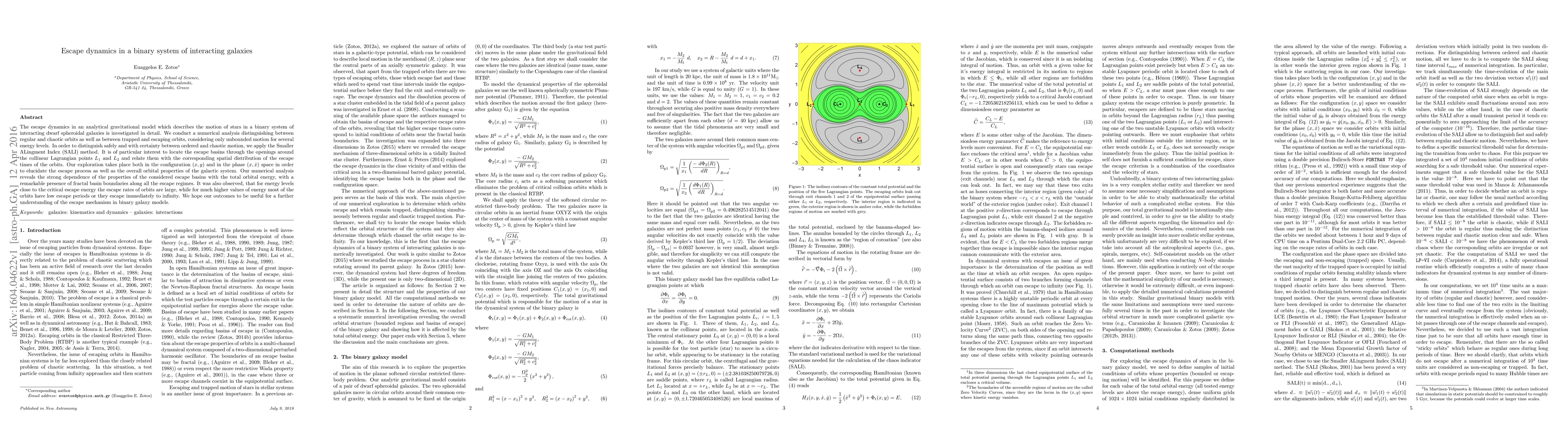 This paper investigates the escape dynamics in a binary system of interacting dwarf galaxies using an analytical gravitational model. It employs numerical analysis to distinguish between regular and chaotic orbits, revealing strong dependence on total orbital energy and fractal basin boundaries, with high escape rates near critical energy levels.