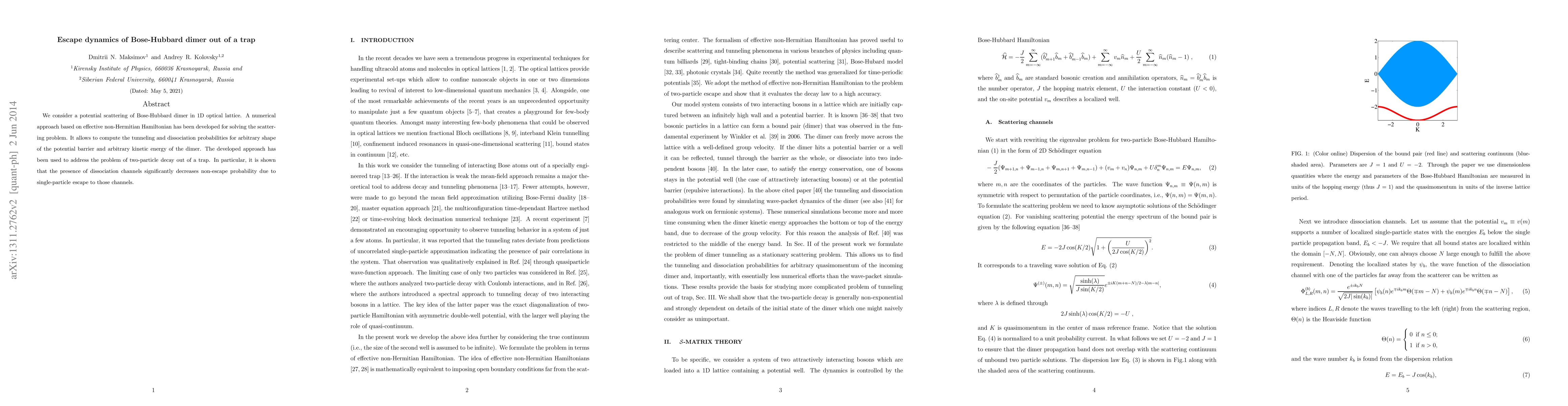 Summary: This study develops a numerical method based on an effective non-Hermitian Hamiltonian to analyze the escape dynamics of a Bose-Hubbard dimer from a 1D optical lattice. The approach computes tunneling and dissociation probabilities, revealing that dissociation channels significantly reduce the probability of non-escape due to single-particle escape.
