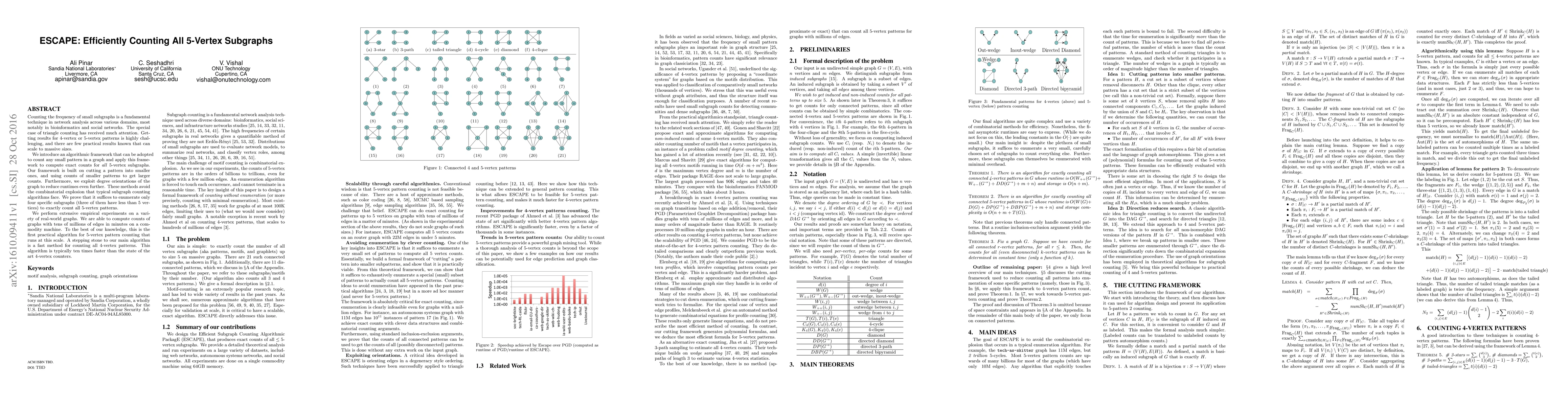 This paper presents ESCAPE, an efficient algorithmic framework for counting all 5-vertex subgraphs in a graph, overcoming the challenges of combinatorial explosion. By decomposing patterns into smaller ones and leveraging degree orientations, it significantly reduces runtime. The method is proven to require enumeration of only four specific subgraphs, including three with fewer than 5 vertices. Extensive experiments on real-world graphs demonstrate the algorithm's capability to compute counts of graphs with tens of millions of edges in minutes on a standard machine, marking a significant advancement in subgraph counting techniques.