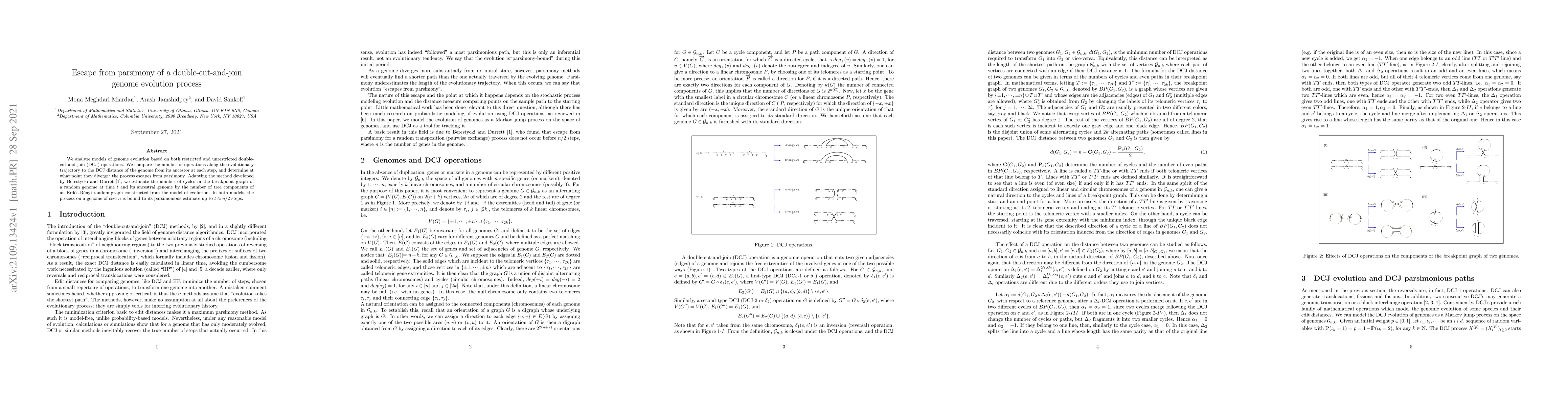 This paper investigates genome evolution models using restricted and unrestricted double-cut-and-join (DCJ) operations, finding that the number of evolutionary steps diverges from the DCJ distance at around $t\approx n/2$ steps, marking the escape from parsimony. The study employs methods from probability theory to estimate cycles in breakpoint graphs.