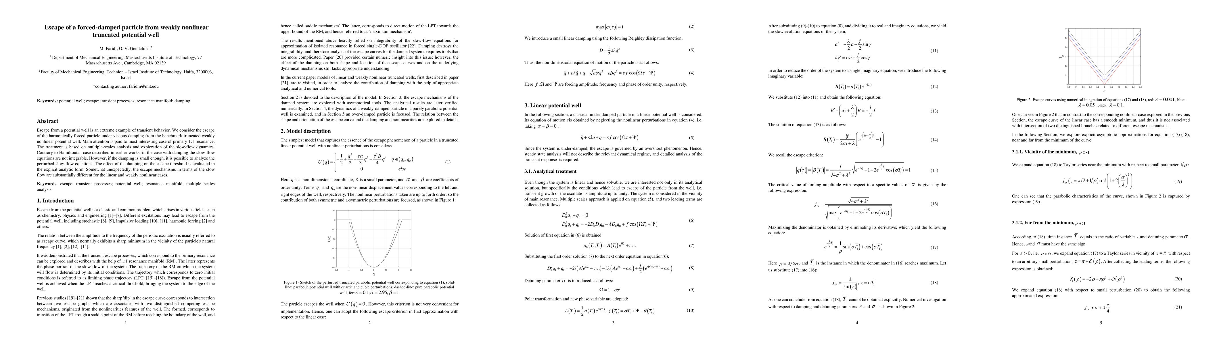 This paper investigates the escape of a forced-damped particle from a truncated weakly nonlinear potential well, focusing on the 1:1 resonance case. The study employs multiple-scales analysis to explore the non-integrable slow-flow dynamics and evaluates the damping effect on the escape threshold, revealing distinct escape mechanisms for linear and weakly nonlinear scenarios.