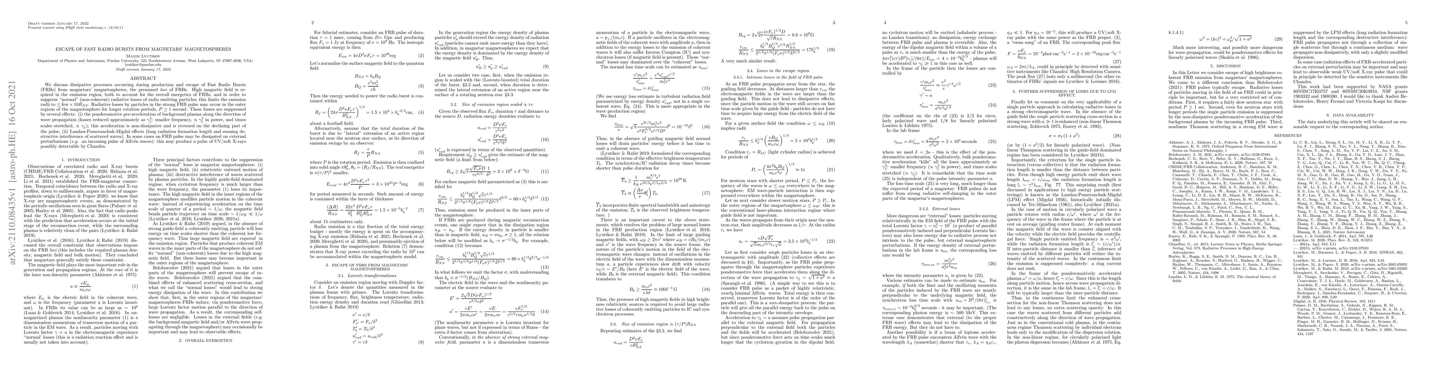 We discuss dissipative processes occurring during production and escape of Fast Radio Bursts (FRBs) from magnetars' magnetospheres, the presumed loci of FRBs. High magnetic fields are required in the emission region, both to account for the overall energetics of FRBs, and in order to suppress ``normal'' (non-coherent) radiative losses of radio emitting particles; this limits the emission radii to $\leq {\rm few} \times 10 R_{NS}$. Radiative losses by particles in the strong FRB pulse may occur in the outer regions of the magnetosphere for longer rotation periods, $P\geq 1$ second. These losses are suppressed by several effects: (i) the ponderomotive pre-acceleration of background plasma along the direction of wave propagation (losses reduced approximately as $\gamma_\parallel^{3}$: smaller frequency, $ \propto \gamma_\parallel^2$ in power, and times scales stretched, $ \propto \gamma_\parallel$); this acceleration is non-dissipative and is reversed on the declining part of the pulse; (ii) Landau-Pomeranchuk-Migdal effects (long radiation formation length and ensuing destructive interference of scattered waves). In some cases an FRB pulse may be dissipated on external perturbations (e.g., an incoming pulse of Alfven waves): this may produce a pulse of UV/soft X-rays, a swan song of an FRB, possibly detectable by Chandra.