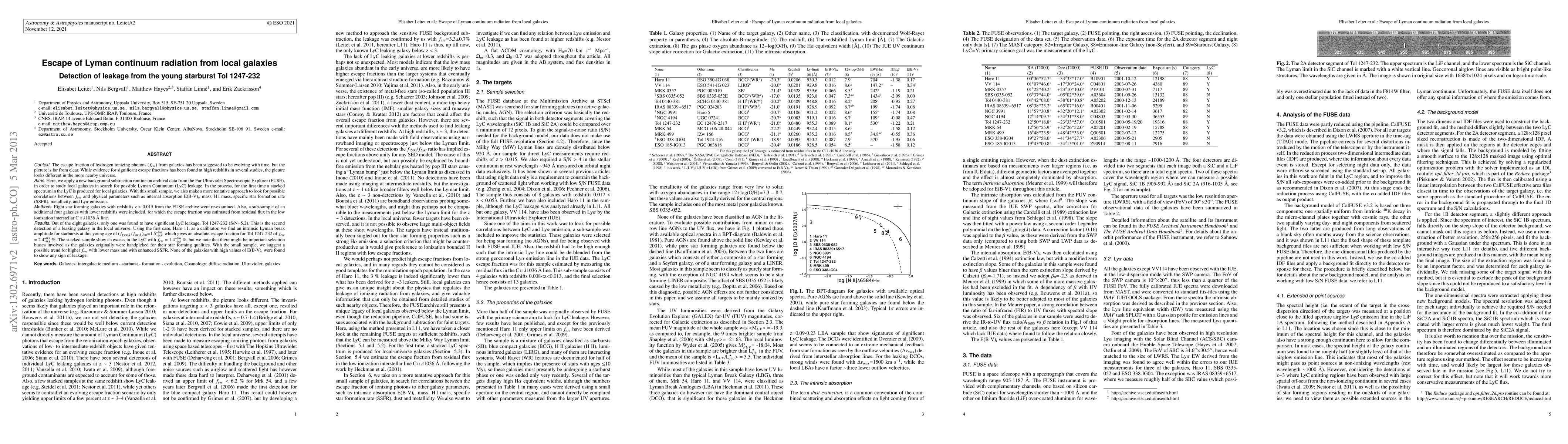 This paper reports the detection of Lyman continuum radiation leakage from the young starburst galaxy Tol 1247-232, marking the second such detection in the local universe. The study suggests a possible correlation between higher escape fractions of ionizing photons and lower mass galaxies with enhanced star formation rates, while noting selection biases and no leakage in high internal absorption environments.