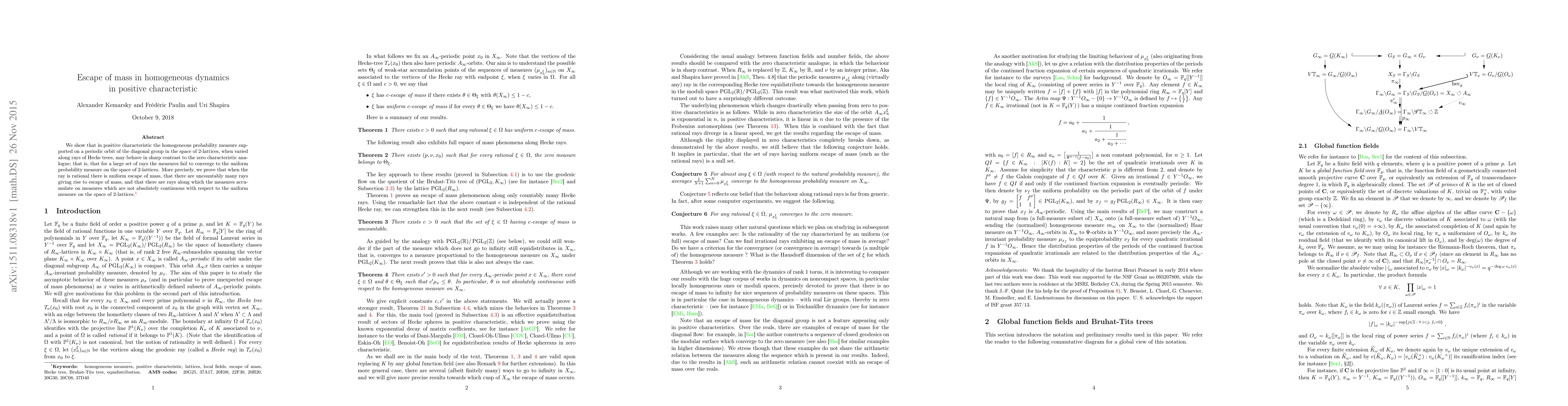 We show that in positive characteristic the homogeneous probability measure supported on a periodic orbit of the diagonal group in the space of 2-lattices, when varied along rays of Hecke trees, may behave in sharp contrast to the zero characteristic analogue; that is, that for a large set of rays the measures fail to converge to the uniform probability measure on the space of 2-lattices. More precisely, we prove that when the ray is rational there is uniform escape of mass, that there are uncountably many rays giving rise to escape of mass, and that there are rays along which the measures accumulate on measures which are not absolutely continuous with respect to the uniform measure on the space of 2-lattices.