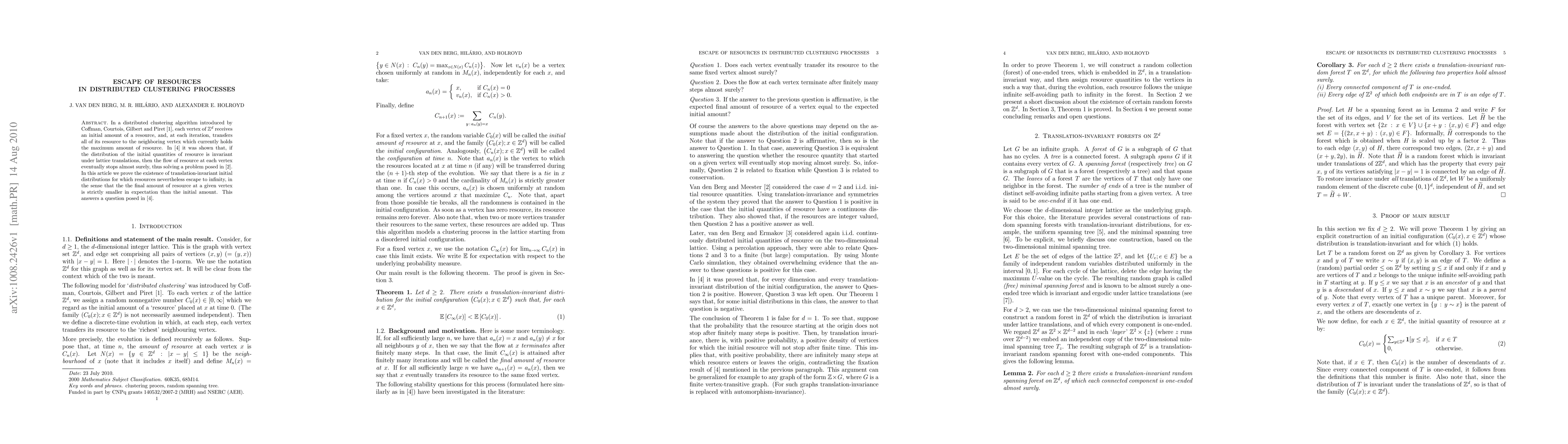 In a distributed clustering algorithm introduced by Coffman, Courtois, Gilbert and Piret \cite{coffman91}, each vertex of $\mathbb{Z}^d$ receives an initial amount of a resource, and, at each iteration, transfers all of its resource to the neighboring vertex which currently holds the maximum amount of resource. In \cite{hlrnss} it was shown that, if the distribution of the initial quantities of resource is invariant under lattice translations, then the flow of resource at each vertex eventually stops almost surely, thus solving a problem posed in \cite{berg91}. In this article we prove the existence of translation-invariant initial distributions for which resources nevertheless escape to infinity, in the sense that the the final amount of resource at a given vertex is strictly smaller in expectation than the initial amount. This answers a question posed in \cite{hlrnss}.