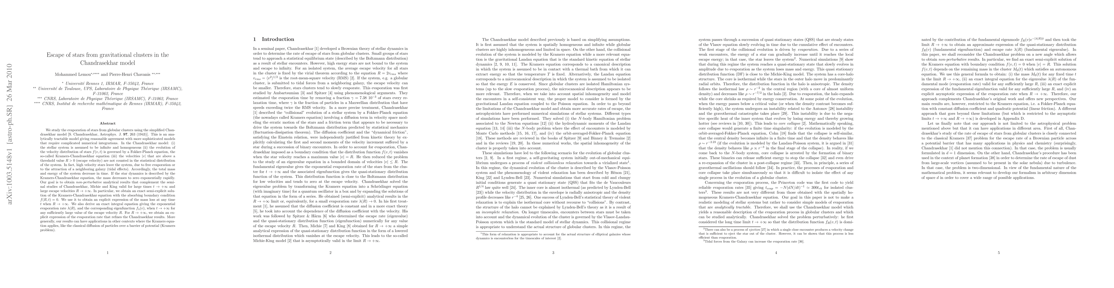 We study the evaporation of stars from globular clusters using the simplified Chandrasekhar model. This is an analytically tractable model giving reasonable agreement with more sophisticated models that require complicated numerical integrations. In the Chandrasekhar model: (i) the stellar system is assumed to be infinite and homogeneous (ii) the evolution of the velocity distribution of stars f(v,t) is governed by a Fokker-Planck equation, the so-called Kramers-Chandrasekhar equation (iii) the velocities |v| that are above a threshold value R>0 (escape velocity) are not counted in the statistical distribution of the system. In fact, high velocity stars leave the system, due to free evaporation or to the attraction of a neighboring galaxy (tidal effects). Accordingly, the total mass and energy of the system decrease in time. If the star dynamics is described by the Kramers-Chandrasekhar equation, the mass decreases to zero exponentially rapidly. Our goal is to obtain non-perturbative analytical results that complement the seminal studies of Chandrasekhar, Michie and King valid for large times $t\to+\infty$ and large escape velocities $R\to +\infty$. In particular, we obtain an exact semi-explicit solution of the Kramers-Chandrasekhar equation with the absorbing boundary condition f(R,t)=0. We use it to obtain an explicit expression of the mass loss at any time t when $R\to +\infty$. We also derive an exact integral equation giving the exponential evaporation rate $\lambda(R)$, and the corresponding eigenfunction $f_{\lambda}(v)$, when $t\to +\infty$ for any sufficiently large value of the escape velocity R. For $R\to +\infty$, we obtain an explicit expression of the evaporation rate that refines the Chandrasekhar results.