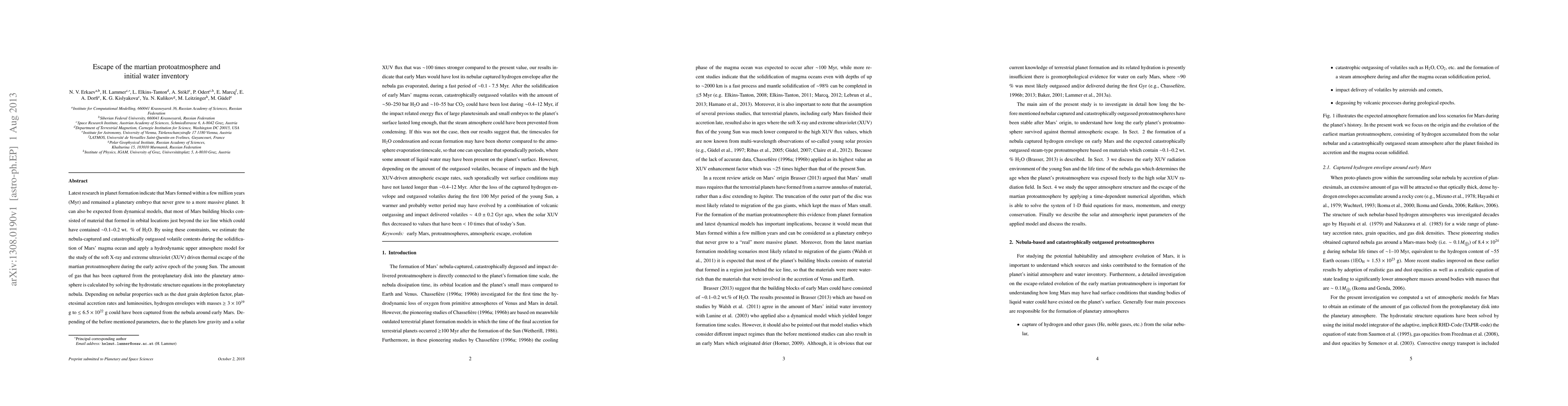 This research investigates the escape of Mars' protoatmosphere and initial water inventory, estimating the volatile contents outgassed during Mars' magma ocean solidification. It finds that early Mars likely lost its nebular-captured hydrogen envelope and catastrophically outgassed volatiles, including water and CO2, due to low gravity and high solar XUV flux during its early active epoch.