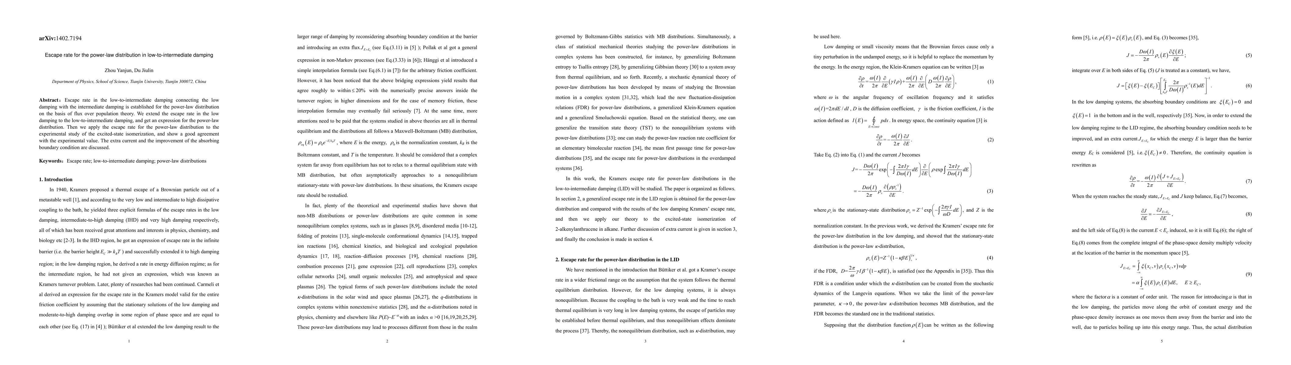 This paper establishes an escape rate expression for the power-law distribution in low-to-intermediate damping, extending previous low damping results and applying it to excited-state isomerization experiments, showing good agreement with observed values. The study also discusses improvements in the absorbing boundary condition and extra current.