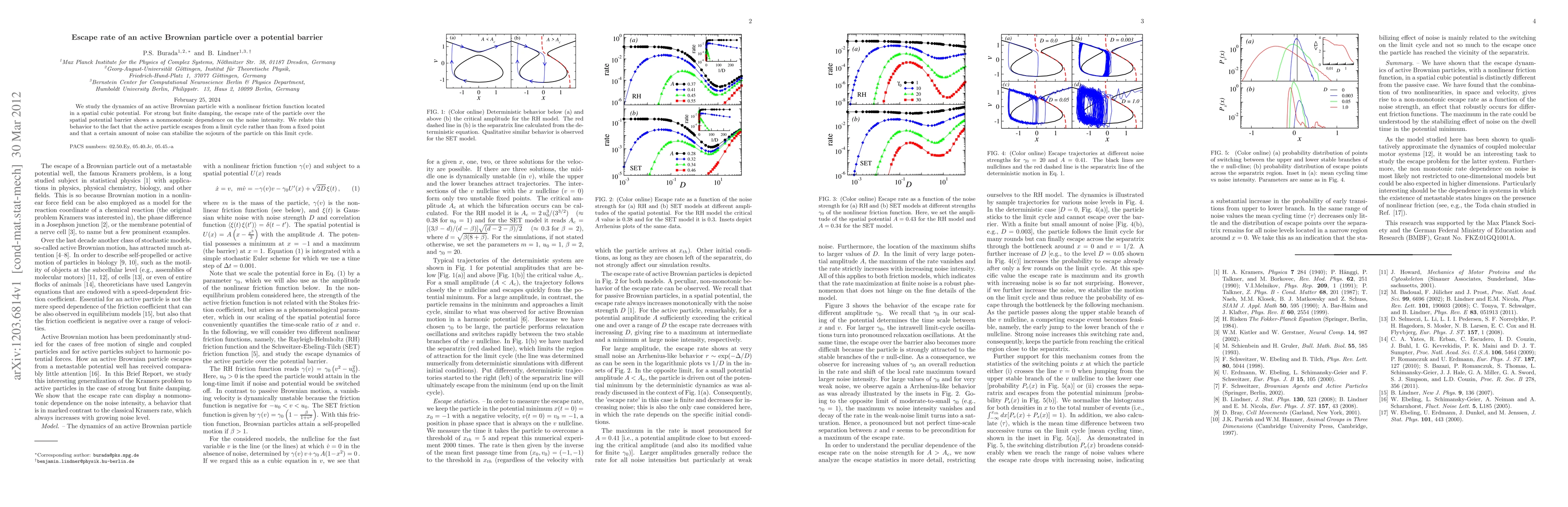 Summary: This study investigates the escape dynamics of an active Brownian particle in a cubic potential, revealing a nonmonotonic escape rate dependence on noise intensity due to the particle's escape from a limit cycle rather than a fixed point, where noise can stabilize its sojourn.