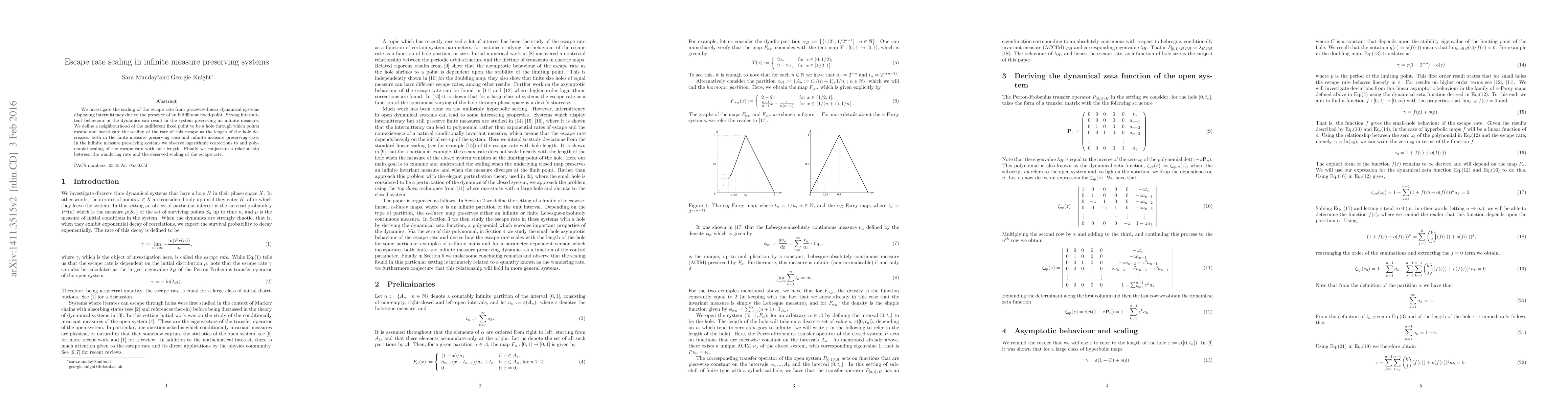 We investigate the scaling of the escape rate from piecewise-linear dynamical systems displaying intermittency due to the presence of an indifferent fixed-point. Strong intermittent behaviour in the dynamics can result in the system preserving an infinite measure. We define a neighbourhood of the indifferent fixed point to be a hole through which points escape and investigate the scaling of the rate of this escape as the length of the hole decreases, both in the finite measure preserving case and infinite measure preserving case. In the infinite measure preserving systems we observe logarithmic corrections to and polynomial scaling of the escape rate with hole length. Finally we conjecture a relationship between the wandering rate and the observed scaling of the escape rate.