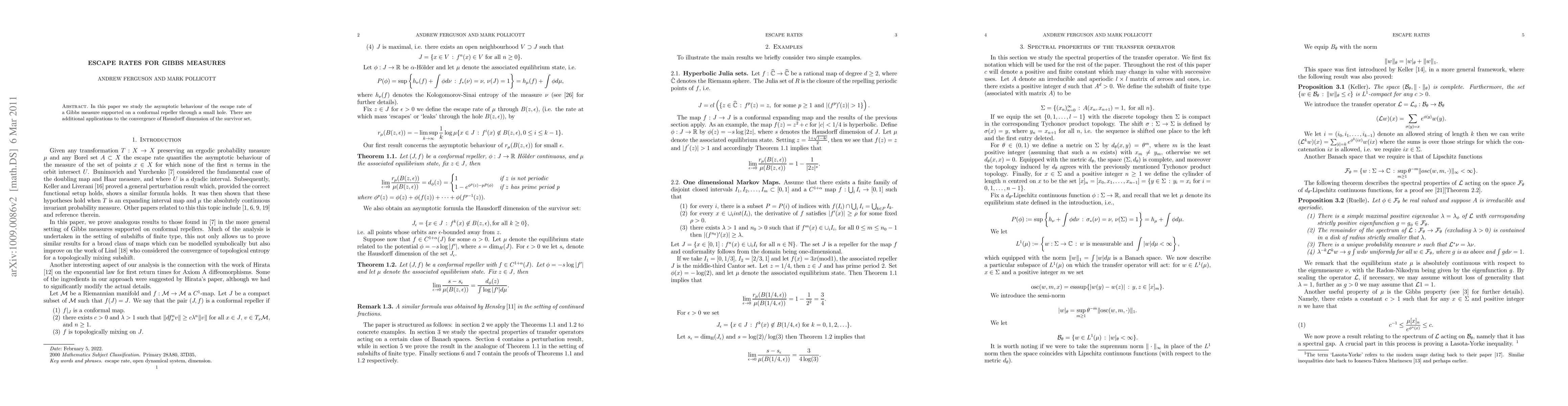 We study the asymptotic behaviour of the escape rate of a Gibbs measure supported on a conformal repeller through a small hole. There are additional applications to the convergence of Hausdorff dimension of the survivor set.