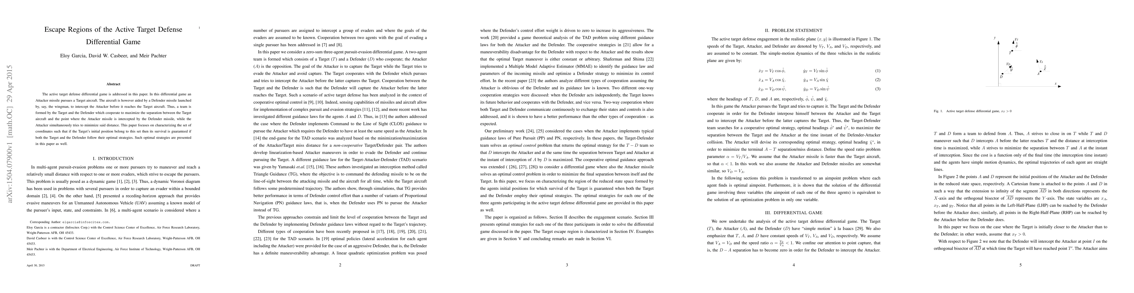 This paper studies the active target defense differential game, where an Attacker missile pursues a Target aircraft aided by a Defender missile, aiming to maximize the separation between the Target and the interception point of the Attacker. It characterizes the escape regions ensuring Target survival if both the Target and Defender follow optimal strategies.