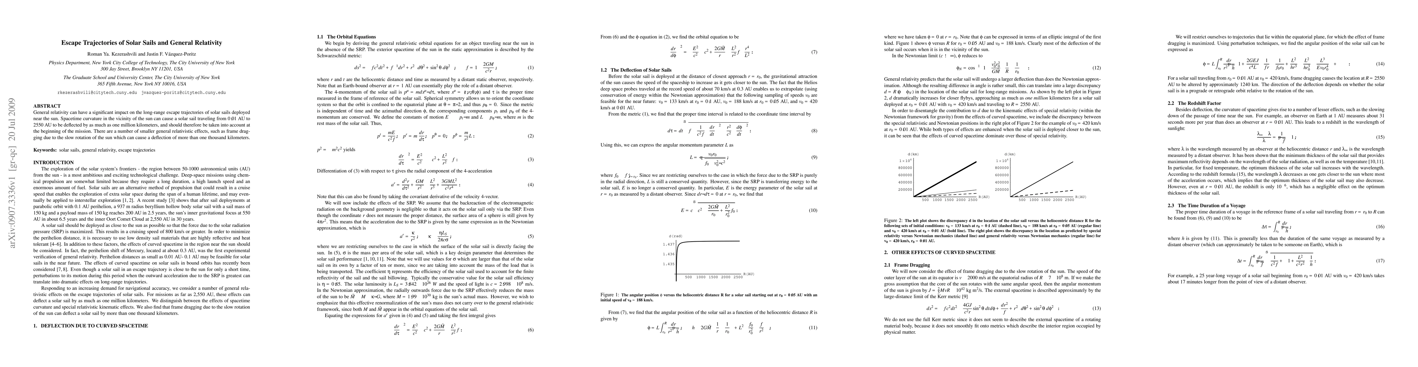This paper explores the influence of general relativity on the escape trajectories of solar sails, revealing significant deflections up to one million kilometers due to the sun's spacetime curvature. It also highlights smaller effects like frame dragging, which can cause additional deflections exceeding one thousand kilometers.