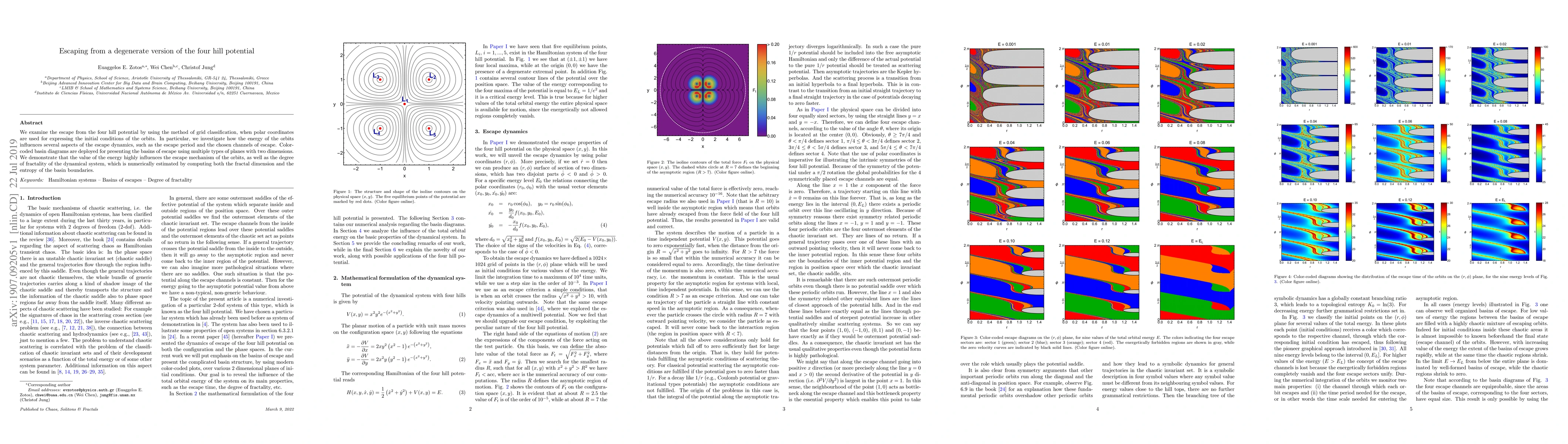 The paper presents a detailed numerical investigation of escape dynamics from a four-hill potential, including the calculation of fractal dimensions and basin entropy as measures of the system's fractality.