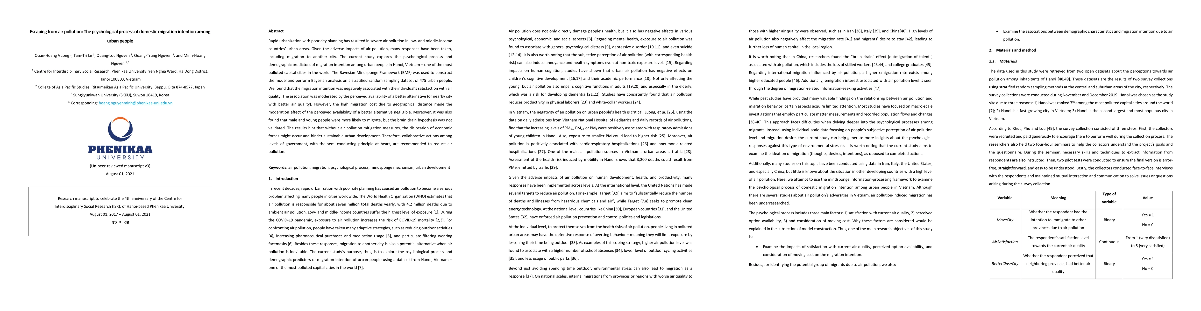 Rapid urbanization with poor city planning has resulted in severe air pollution in low- and middle-income countries' urban areas. Given the adverse impacts of air pollution, many responses have been taken, including migration to another city. The current study explores the psychological process and demographic predictors of migration intention among urban people in Hanoi, Vietnam - one of the most polluted capital cities in the world. The Bayesian Mindsponge Framework (BMF) was used to construct the model and perform Bayesian analysis on a stratified random sampling dataset of 475 urban people. We found that the migration intention was negatively associated with the individual's satisfaction with air quality. The association was moderated by the perceived availability of a better alternative (or nearby city with better air quality). However, the high migration cost due to geographical distance made the moderation effect of the perceived availability of a better alternative negligible. Moreover, it was also found that male and young people were more likely to migrate, but the brain drain hypothesis was not validated. The results hint that without air pollution mitigation measures, the dislocation of economic forces might occur and hinder sustainable urban development. Therefore, collaborative actions among levels of government, with the semi-conducting principle at heart, are recommended to reduce air pollution.
