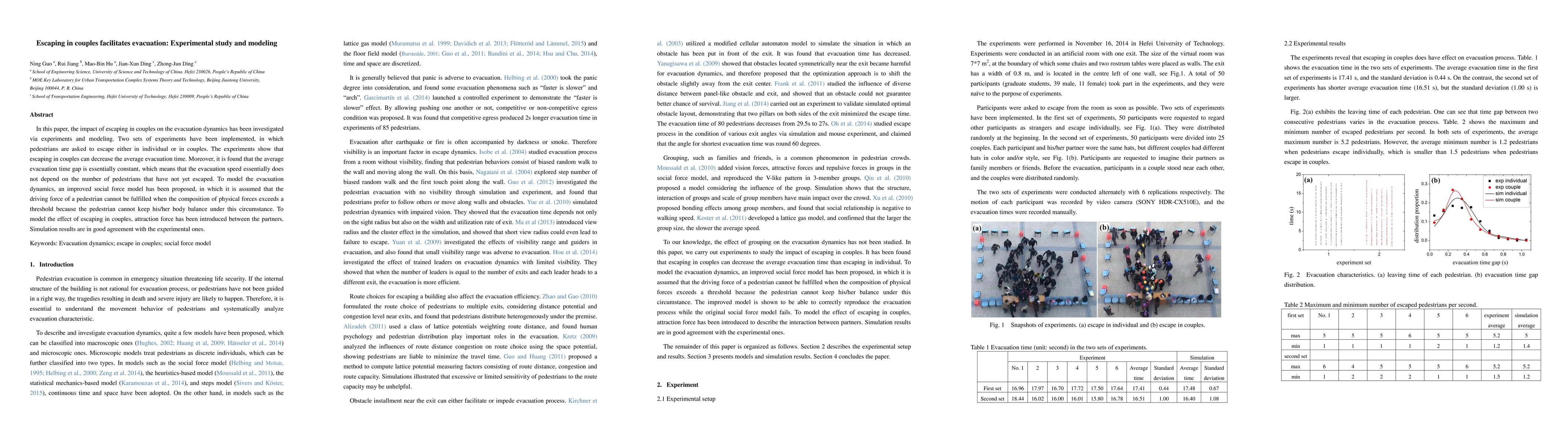 This study investigates how couples evacuating together can decrease average evacuation time compared to individuals, based on experiments and modeling. An improved social force model incorporating attraction forces between partners in couples shows consistent simulation results with the experiments.