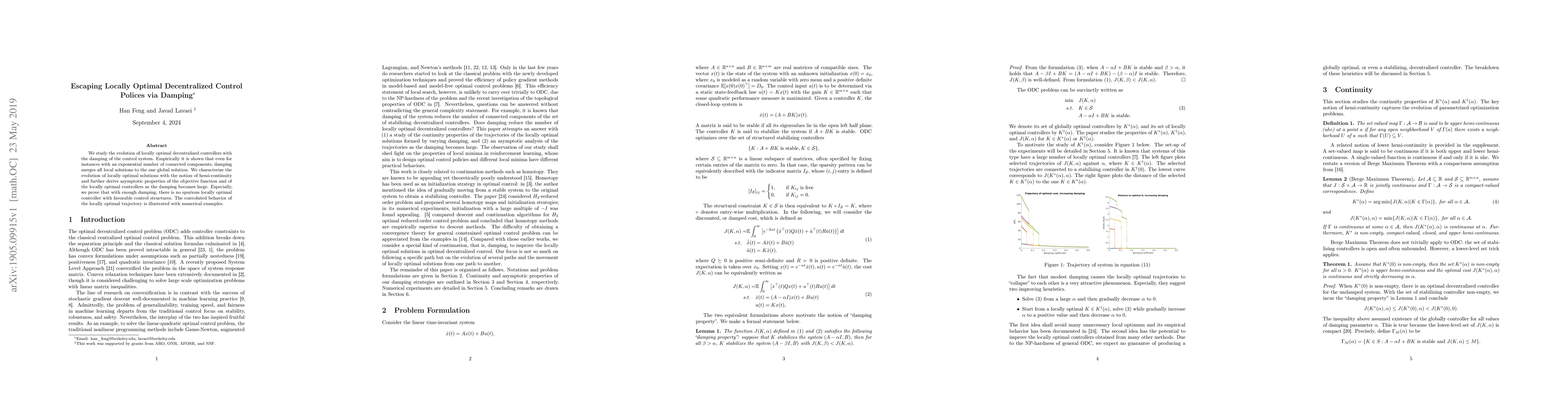 This paper investigates how damping in decentralized control systems can escape locally optimal policies, demonstrating that it merges local solutions into a global one, even in complex systems with many components. It characterizes the evolution of locally optimal solutions using hemi-continuity and proves that sufficient damping eliminates spurious local optima, supported by numerical examples.