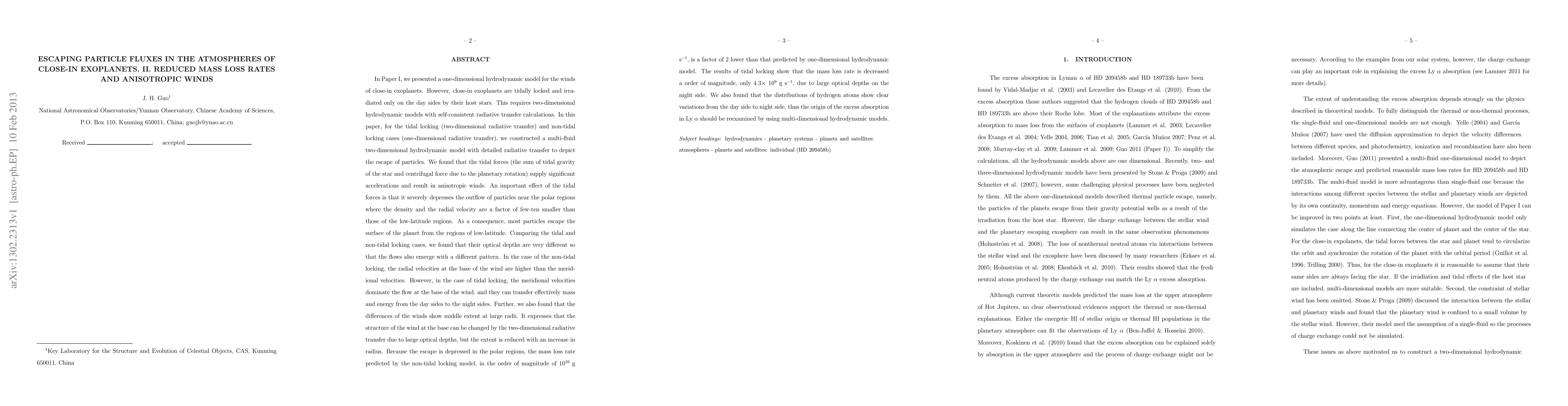 We constructed a multi-fluid two-dimensional hydrodynamic model with detailed radiative transfer to depict the escape of particles. We found that the tidal forces supply significant accelerations and result in anisotropic winds. An important effect of the tidal forces is that it severely depresses the outflow of particles near the polar regions. As a consequence, most particles escape the surface of the planet from the regions of low-latitude. Comparing the tidal and non-tidal locking cases, we found that their optical depths are very different so that the flows also emerge with a different pattern. In the case of the non-tidal locking, the radial velocities at the base of the wind are higher than the meridional velocities. However, in the case of tidal locking, the meridional velocities dominate the flow at the base of the wind, and they can transfer effectively mass and energy from the day sides to the night sides. Further, we also found that the differences of the winds show middle extent at large radii. It expresses that the structure of the wind at the base can be changed by the two-dimensional radiative transfer due to large optical depths, but the extent is reduced with an increase in radius. Because the escape is depressed in the polar regions, the mass loss rate predicted by the non-tidal locking model, in the order of magnitude of $10^{10}$ g s$^{-1}$, is a factor of 2 lower than that predicted by one-dimensional hydrodynamic model. The results of tidal locking show that the mass loss rate is decreased a order of magnitude, only 4.3$\times$ $10^{9}$ g s$^{-1}$, due to large optical depths on the night side. We also found that the distributions of hydrogen atoms show clear variations from the day side to night side, thus the origin of the excess absorption in Ly $\alpha$ should be reexamined by using multi-dimensional hydrodynamic models.