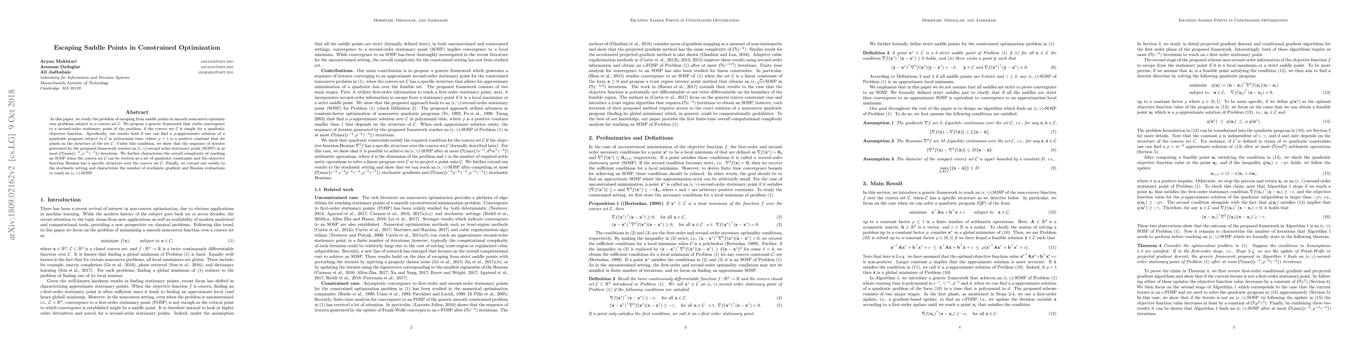 In this paper, we study the problem of escaping from saddle points in smooth nonconvex optimization problems subject to a convex set $\mathcal{C}$. We propose a generic framework that yields convergence to a second-order stationary point of the problem, if the convex set $\mathcal{C}$ is simple for a quadratic objective function. Specifically, our results hold if one can find a $\rho$-approximate solution of a quadratic program subject to $\mathcal{C}$ in polynomial time, where $\rho<1$ is a positive constant that depends on the structure of the set $\mathcal{C}$. Under this condition, we show that the sequence of iterates generated by the proposed framework reaches an $(\epsilon,\gamma)$-second order stationary point (SOSP) in at most $\mathcal{O}(\max\{\epsilon^{-2},\rho^{-3}\gamma^{-3}\})$ iterations. We further characterize the overall complexity of reaching an SOSP when the convex set $\mathcal{C}$ can be written as a set of quadratic constraints and the objective function Hessian has a specific structure over the convex set $\mathcal{C}$. Finally, we extend our results to the stochastic setting and characterize the number of stochastic gradient and Hessian evaluations to reach an $(\epsilon,\gamma)$-SOSP.