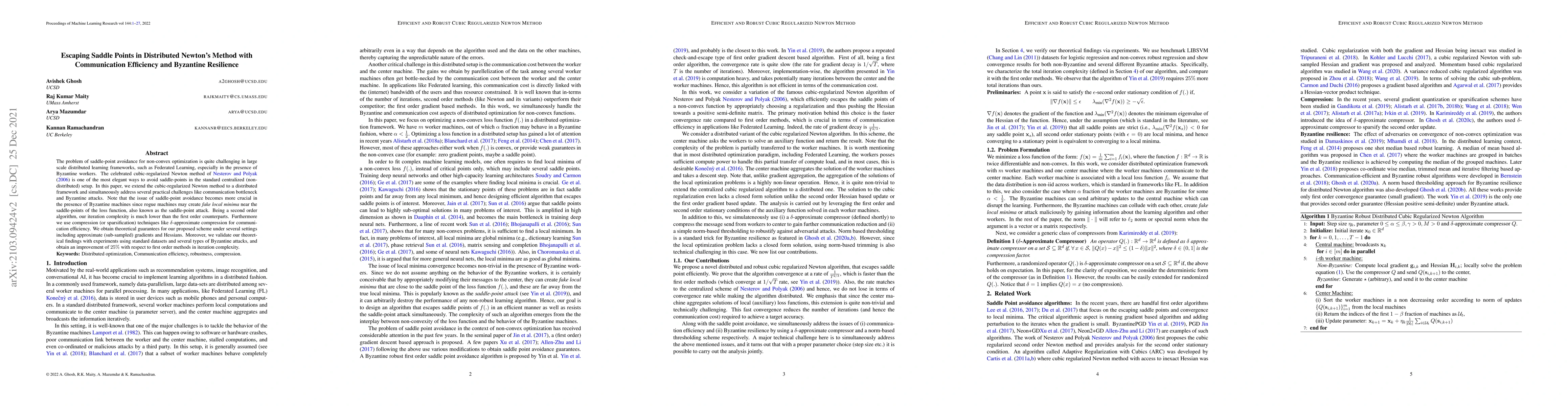 This paper extends the cubic-regularized Newton method to a distributed framework to tackle saddle-point avoidance in non-convex optimization, addressing communication bottlenecks and Byzantine resilience. The proposed method achieves lower iteration complexity compared to first-order methods and demonstrates a 25% improvement in iteration complexity through experiments.