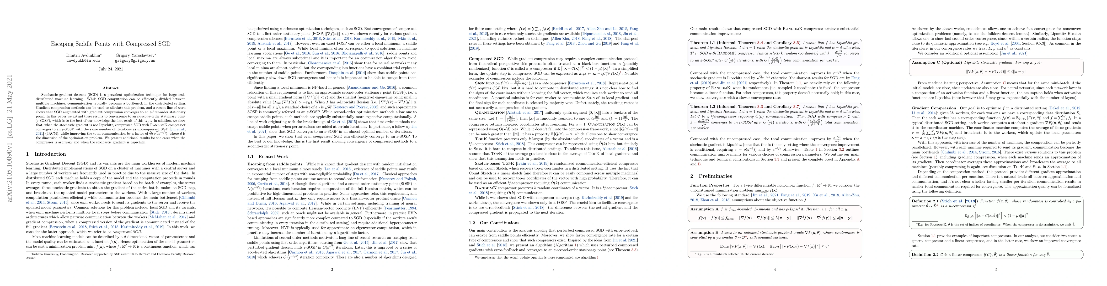 This paper extends the convergence of compressed SGD to $\varepsilon$-second-order stationary points, improving communication efficiency by a factor of $\tilde \Theta(\sqrt{d} \varepsilon^{-3/4})$ compared to uncompressed SGD, while maintaining the same number of iterations. It also discusses convergence under non-Lipschitz stochastic gradients and arbitrary compressors.