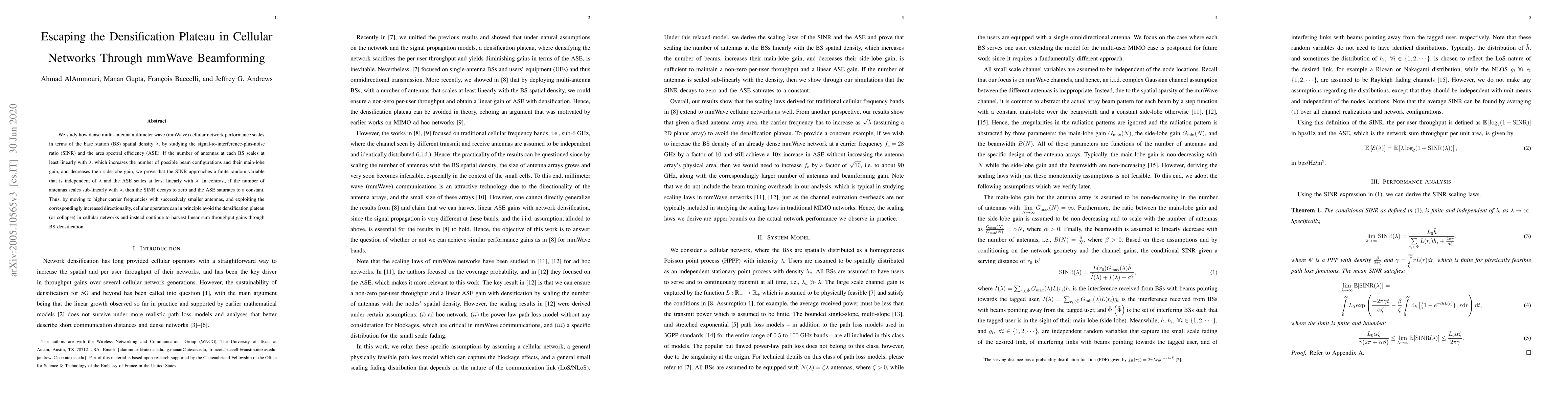 We study how dense multi-antenna millimeter wave (mmWave) cellular network performance scales in terms of the base station (BS) spatial density $\lambda$, by studying the signal-to-interference-plus-noise ratio (SINR) and the area spectral efficiency (ASE). If the number of antennas at each BS scales at least linearly with $\lambda$, which increases the number of possible beam configurations and their main-lobe gain, and decreases their side-lobe gain, we prove that the SINR approaches a finite random variable that is independent of $\lambda$ and the ASE scales at least linearly with $\lambda$. In contrast, if the number of antennas scales sub-linearly with $\lambda$, then the SINR decays to zero and the ASE saturates to a constant. Thus, by moving to higher carrier frequencies with successively smaller antennas, and exploiting the correspondingly increased directionality, cellular operators can in principle avoid the densification plateau (or collapse) in cellular networks and instead continue to harvest linear sum throughput gains through BS densification.