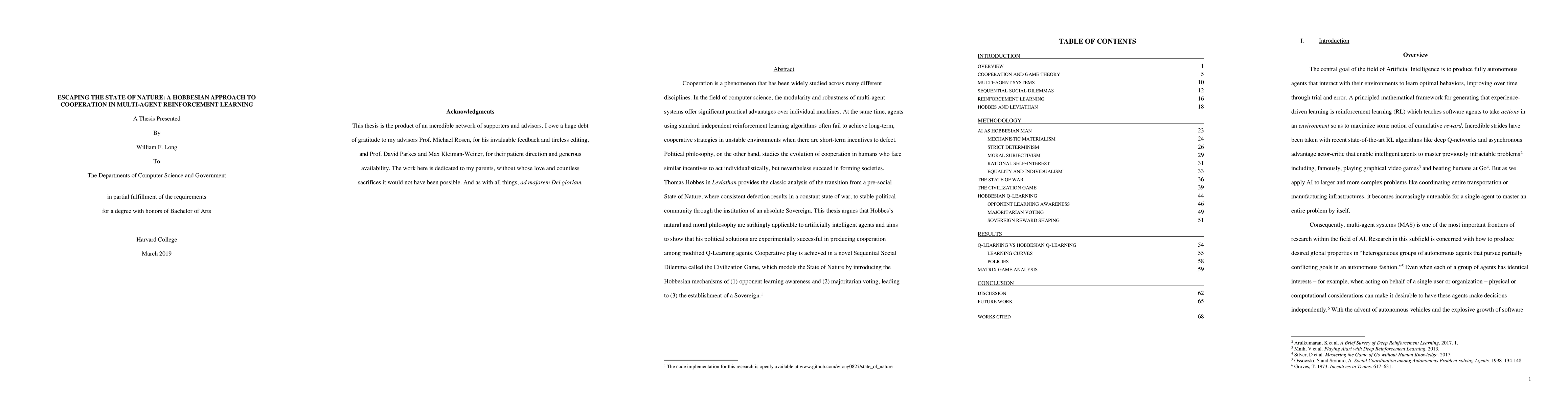Cooperation is a phenomenon that has been widely studied across many different disciplines. In the field of computer science, the modularity and robustness of multi-agent systems offer significant practical advantages over individual machines. At the same time, agents using standard reinforcement learning algorithms often fail to achieve long-term, cooperative strategies in unstable environments when there are short-term incentives to defect. Political philosophy, on the other hand, studies the evolution of cooperation in humans who face similar incentives to act individualistically, but nevertheless succeed in forming societies. Thomas Hobbes in Leviathan provides the classic analysis of the transition from a pre-social State of Nature, where consistent defection results in a constant state of war, to stable political community through the institution of an absolute Sovereign. This thesis argues that Hobbes's natural and moral philosophy are strikingly applicable to artificially intelligent agents and aims to show that his political solutions are experimentally successful in producing cooperation among modified Q-Learning agents. Cooperative play is achieved in a novel Sequential Social Dilemma called the Civilization Game, which models the State of Nature by introducing the Hobbesian mechanisms of opponent learning awareness and majoritarian voting, leading to the establishment of a Sovereign.