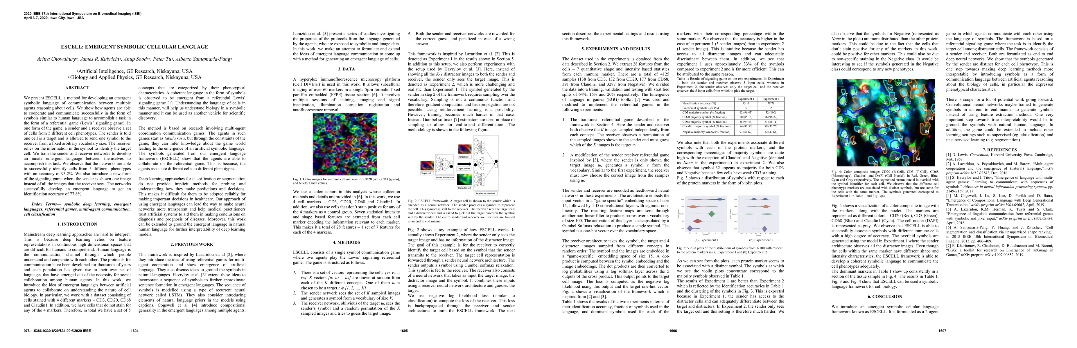 ESCELL is a method enabling multiple agents to develop an emergent symbolic language for cell identification, achieving 93.2% accuracy in a referential game. It also adapts to a new game format where the sender sees only one image, achieving 77.8% accuracy.