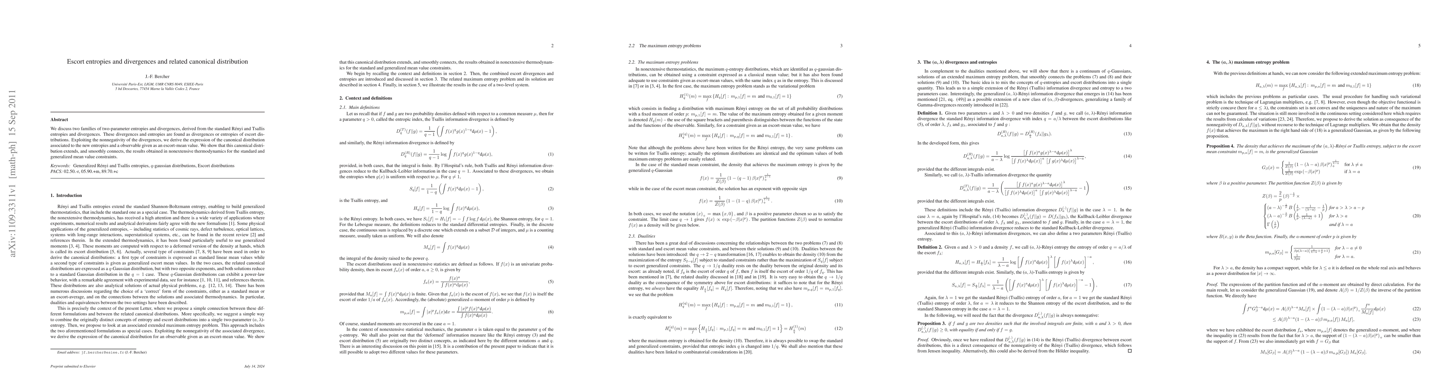 This paper introduces two families of two-parameter entropies and divergences derived from R\'enyi and Tsallis measures, focusing on escort distributions. The study derives the canonical distribution linked to these new entropies, demonstrating a smooth extension and connection to nonextensive thermodynamics.