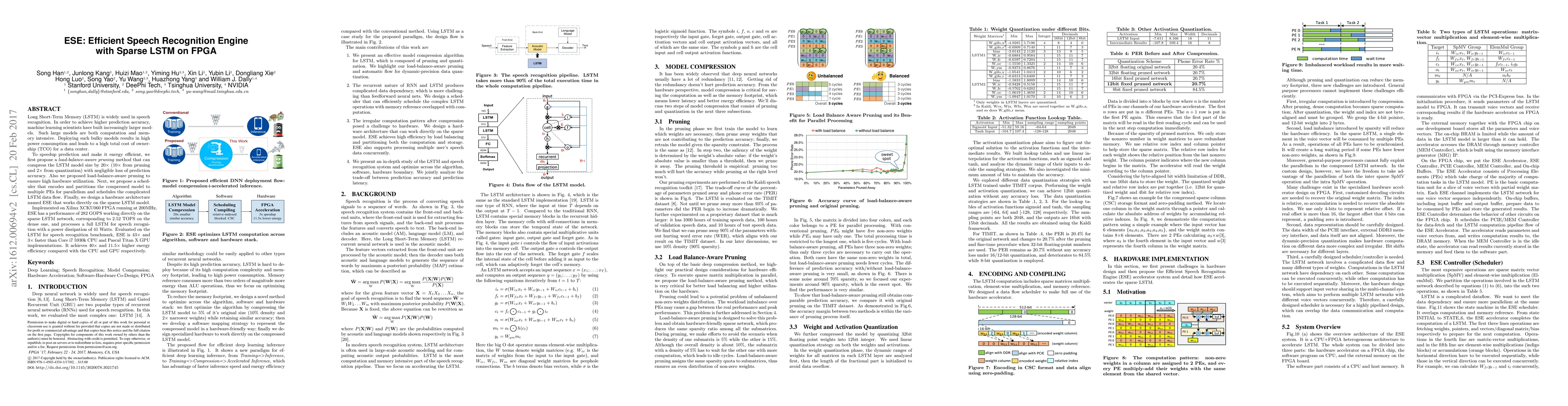 Long Short-Term Memory (LSTM) is widely used in speech recognition. In order to achieve higher prediction accuracy, machine learning scientists have built larger and larger models. Such large model is both computation intensive and memory intensive. Deploying such bulky model results in high power consumption and leads to high total cost of ownership (TCO) of a data center. In order to speedup the prediction and make it energy efficient, we first propose a load-balance-aware pruning method that can compress the LSTM model size by 20x (10x from pruning and 2x from quantization) with negligible loss of the prediction accuracy. The pruned model is friendly for parallel processing. Next, we propose scheduler that encodes and partitions the compressed model to each PE for parallelism, and schedule the complicated LSTM data flow. Finally, we design the hardware architecture, named Efficient Speech Recognition Engine (ESE) that works directly on the compressed model. Implemented on Xilinx XCKU060 FPGA running at 200MHz, ESE has a performance of 282 GOPS working directly on the compressed LSTM network, corresponding to 2.52 TOPS on the uncompressed one, and processes a full LSTM for speech recognition with a power dissipation of 41 Watts. Evaluated on the LSTM for speech recognition benchmark, ESE is 43x and 3x faster than Core i7 5930k CPU and Pascal Titan X GPU implementations. It achieves 40x and 11.5x higher energy efficiency compared with the CPU and GPU respectively.