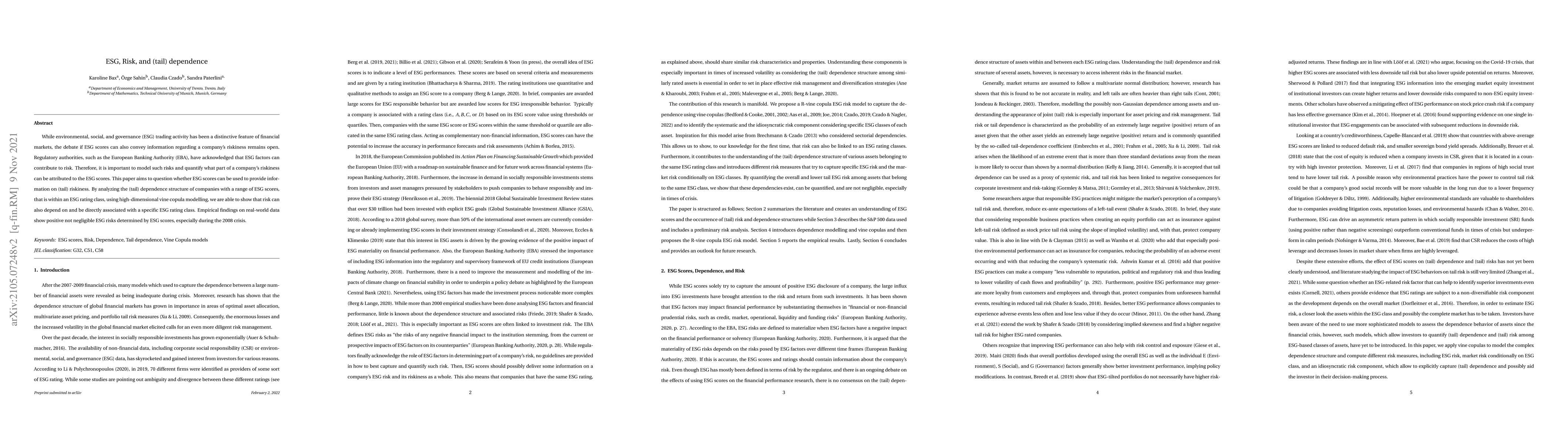 A study finds that ESG scores can convey information on a company's riskiness, particularly during crises like the 2008 financial crisis. High-dimensional vine copula modeling reveals direct associations between specific ESG rating classes and increased risk.