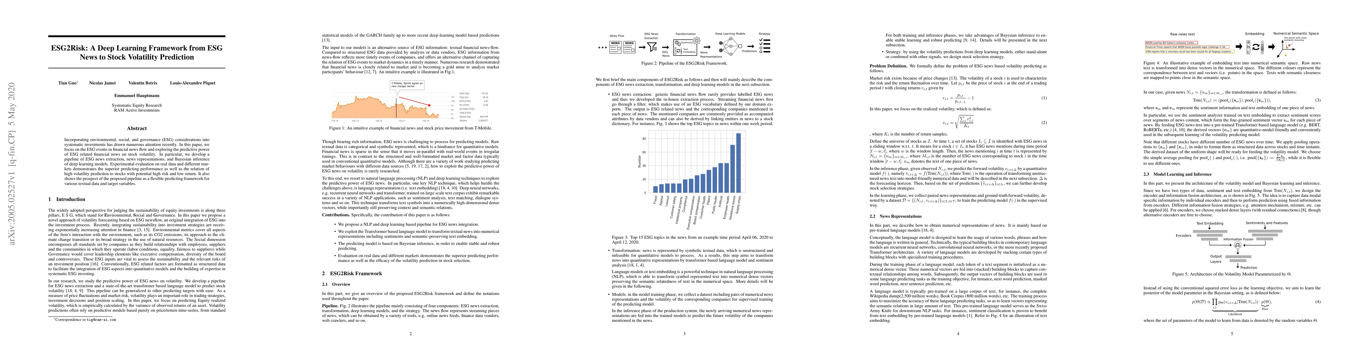 This paper presents ESG2Risk, a deep learning framework that utilizes ESG-related financial news to predict stock volatility. It employs a pipeline for ESG news extraction, representation, and Bayesian deep learning inference, demonstrating superior predictive performance and a correlation between high volatility predictions and stocks with high risk and low return.