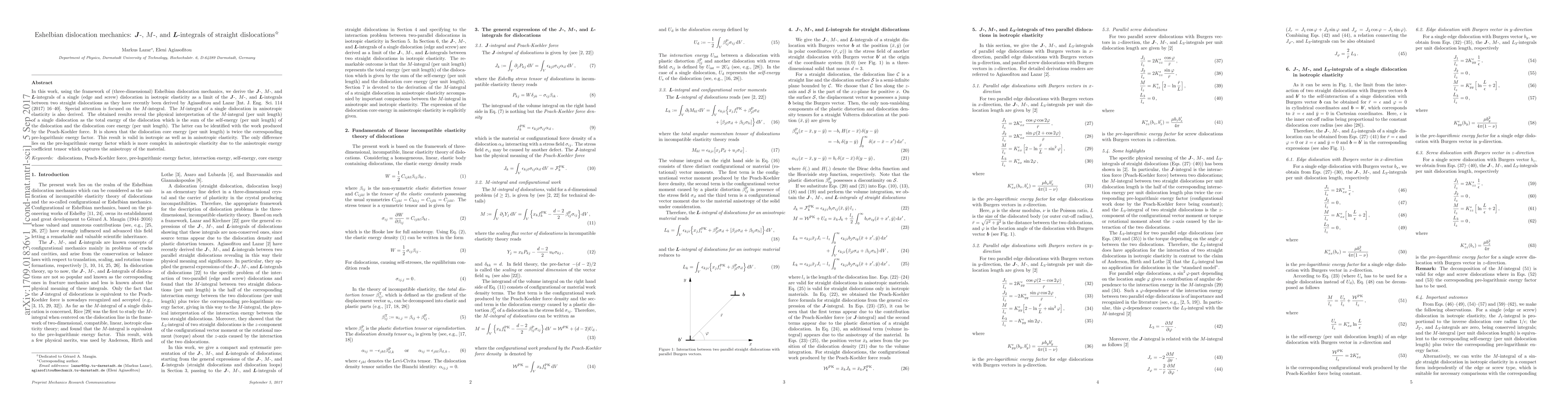 This paper derives the $J$-, $M$-, and $L$-integrals for single dislocations in isotropic elasticity within Eshelbian dislocation mechanics, extending previous work on integrals between two dislocations. Special focus is given to the $M$-integral, which is interpreted as the total energy of a dislocation, comprising self-energy and dislocation core energy. The core energy is shown to be twice the pre-logarithmic energy factor, with differences arising in anisotropic elasticity due to the material's anisotropic energy coefficient tensor.