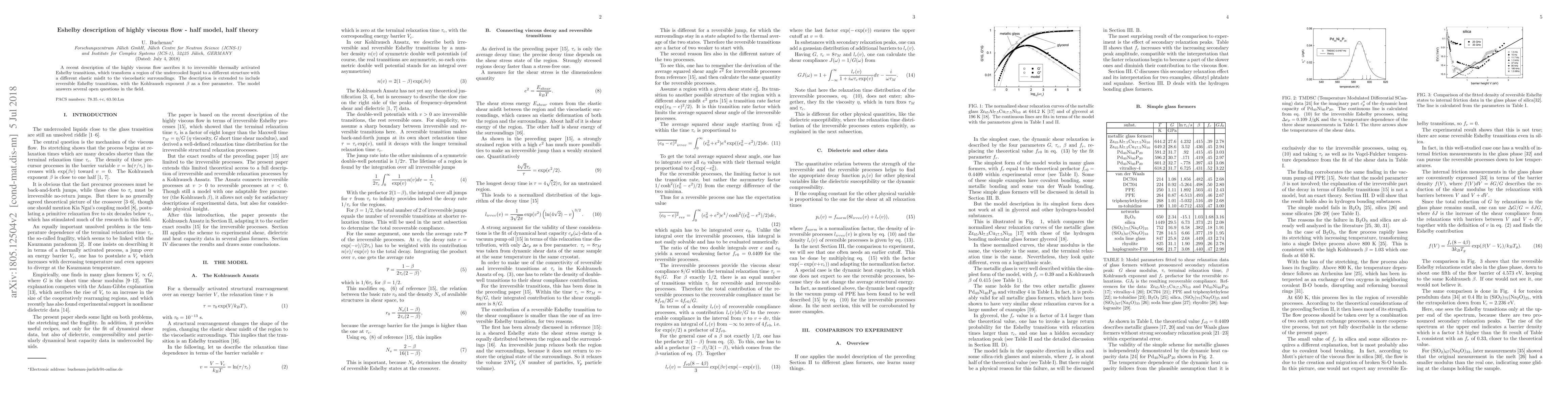 A recent description of the highly viscous flow ascribes it to irreversible thermally activated Eshelby transitions, which transform a region of the undercooled liquid to a different structure with a different elastic misfit to the viscoelastic surroundings. The description is extended to include reversible Eshelby transitions, with the Kohlrausch exponent $\beta$ as a free parameter. The model answers several open questions in the field.