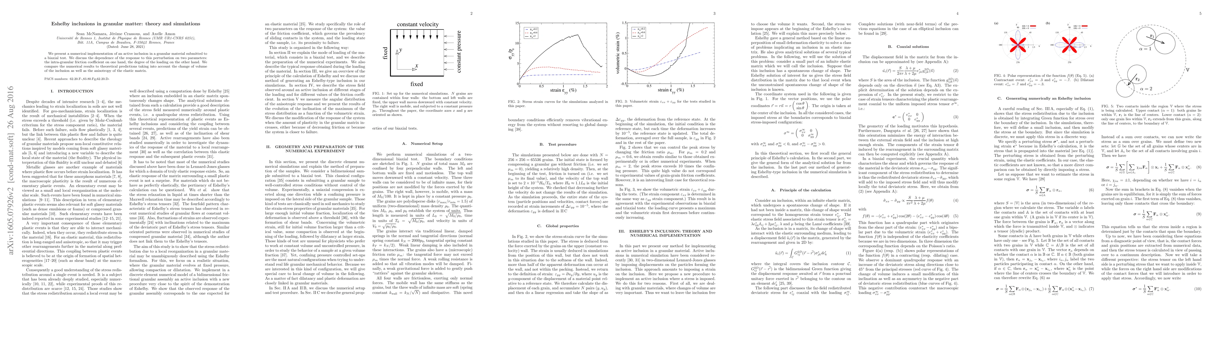 We present a numerical implementation of an active inclusion in a granular material submitted to a biaxial test. We discuss the dependence of the response to this perturbation on two parameters: the intra-granular friction coefficient on one hand, the degree of the loading on the other hand. We compare the numerical results to theoretical predictions taking into account the change of volume of the inclusion as well as the anisotropy of the elastic matrix.