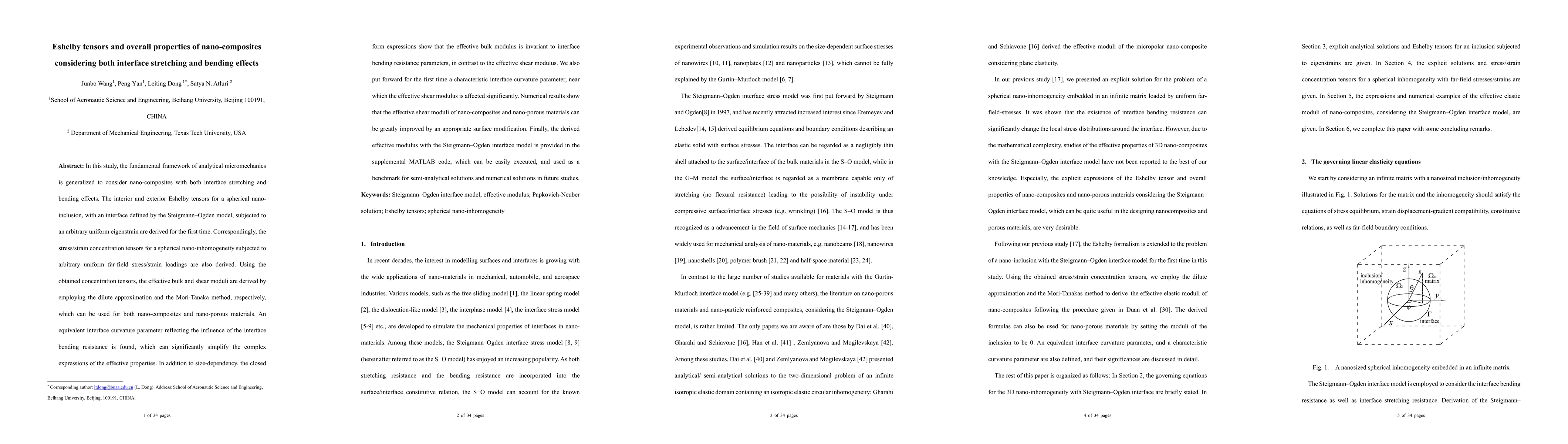 This paper generalizes analytical micromechanics to analyze nano-composites considering both interface stretching and bending effects. It derives Eshelby tensors for spherical nano-inclusions and effective bulk and shear moduli, revealing that while the bulk modulus is invariant to bending, the shear modulus is significantly influenced by an appropriate interface curvature parameter.