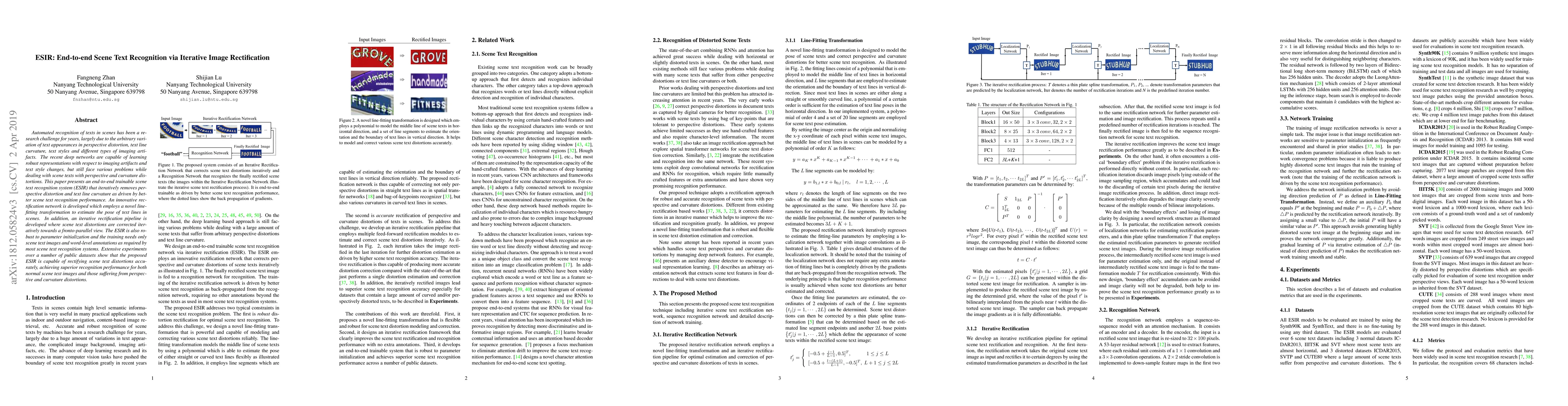 The ESIR system presents an end-to-end trainable approach for scene text recognition that iteratively corrects perspective distortion and text line curvature through an innovative rectification network. The method achieves superior recognition performance over public datasets by iteratively transforming scene text to a fronto-parallel view.