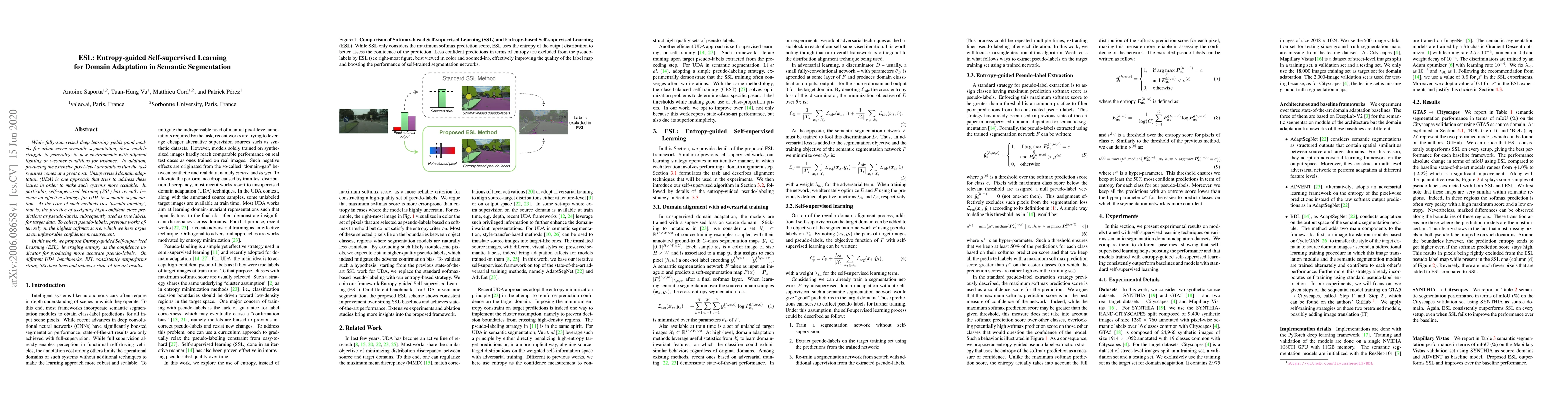 This paper proposes Entropy-guided Self-supervised Learning (ESL) for unsupervised domain adaptation in semantic segmentation, using entropy as a more reliable confidence indicator than softmax scores for generating pseudo-labels. ESL achieves state-of-the-art results on various benchmarks, demonstrating improved generalization to new environments.