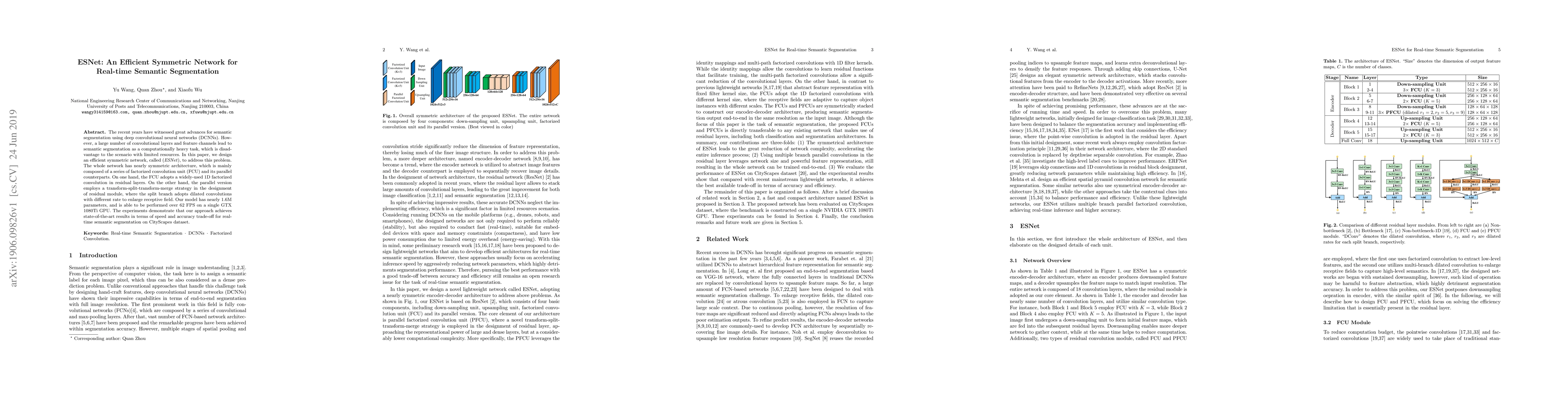 ESNet presents an efficient symmetric network designed for real-time semantic segmentation, utilizing factorized convolution units and parallel counterparts to achieve a balance between speed and accuracy. The model achieves state-of-the-art results on the CityScapes dataset with over 62 FPS on a single GPU.