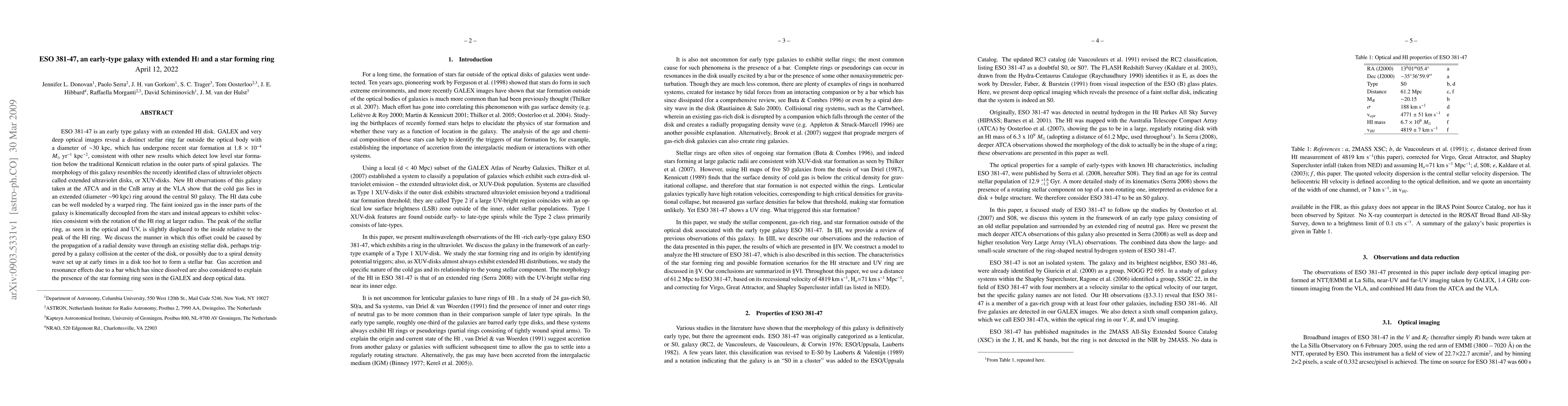 ESO 381-47 is an early type galaxy with an extended HI disk. GALEX and very deep optical images reveal a distinct stellar ring far outside the optical body with a diameter of ~30 kpc, which has undergone recent star formation at 1.8 x 10^-4 Msun/yr/kpc^-2, consistent with other new results which detect low level star formation below the traditional Kennicutt relation in the outer parts of spiral galaxies. The morphology of this galaxy resembles the recently identified class of ultraviolet objects called extended ultraviolet disks, or XUV-disks. New HI observations of this galaxy taken at the ATCA and in the CnB array at the VLA show that the cold gas lies in an extended (diameter ~90 kpc) ring around the central S0 galaxy. The HI data cube can be well modeled by a warped ring. The faint ionized gas in the inner parts of the galaxy is kinematically decoupled from the stars and instead appears to exhibit velocities consistent with the rotation of the HI ring at larger radius. The peak of the stellar ring, as seen in the optical and UV, is slightly displaced to the inside relative to the peak of the HI ring. We discuss the manner in which this offset could be caused by the propagation of a radial density wave through an existing stellar disk, perhaps triggered by a galaxy collision at the center of the disk, or possibly due to a spiral density wave set up at early times in a disk too hot to form a stellar bar. Gas accretion and resonance effects due to a bar which has since dissolved are also considered to explain the presence of the star forming ring seen in the GALEX and deep optical data.
