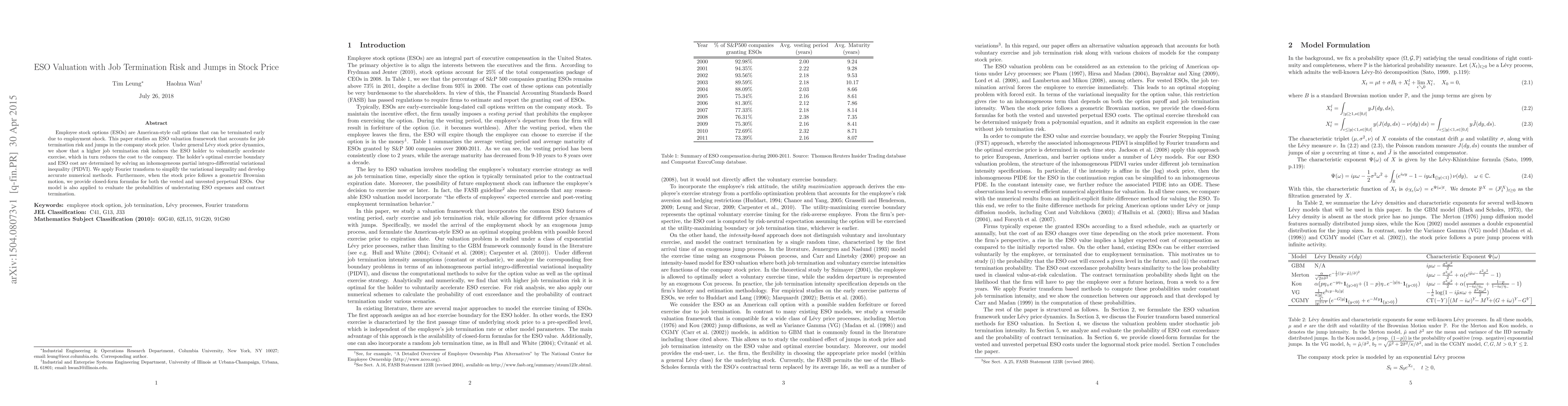 Employee stock options (ESOs) are American-style call options that can be terminated early due to employment shock. This paper studies an ESO valuation framework that accounts for job termination risk and jumps in the company stock price. Under general L\'evy stock price dynamics, we show that a higher job termination risk induces the ESO holder to voluntarily accelerate exercise, which in turn reduces the cost to the company. The holder's optimal exercise boundary and ESO cost are determined by solving an inhomogeneous partial integro-differential variational inequality (PIDVI). We apply Fourier transform to simplify the variational inequality and develop accurate numerical methods. Furthermore, when the stock price follows a geometric Brownian motion, we provide closed-form formulas for both the vested and unvested perpetual ESOs. Our model is also applied to evaluate the probabilities of understating ESO expenses and contract termination.