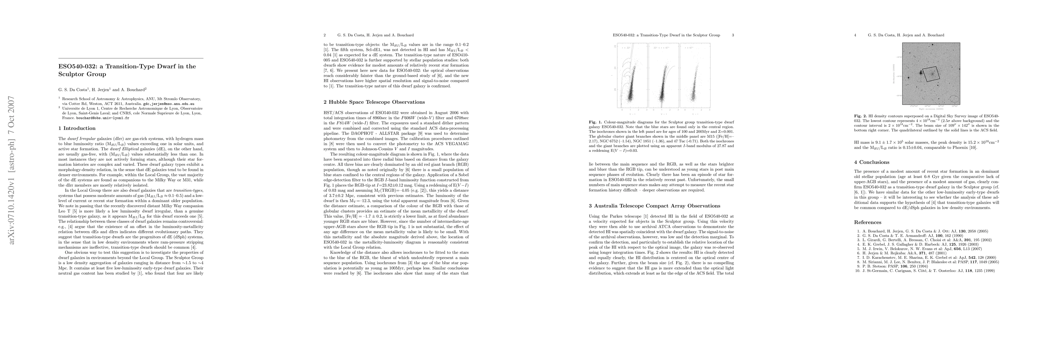 The research paper presents a HST/ACS color-magnitude diagram of the Sculptor group dwarf galaxy ESO540-032, revealing an old red giant population with a younger (~100 Myr) blue star population in its central regions. The galaxy's distance is confirmed as 3.7 +/- 0.2 Mpc, and its mean metallicity as [Fe/H] = -1.7 +/- 0.2. HI observations with the Australian Telescope Compact Array confirm approximately 10^6 solar masses of HI gas, placing ESO540-032 as a transition-type dwarf in the Sculptor group.
